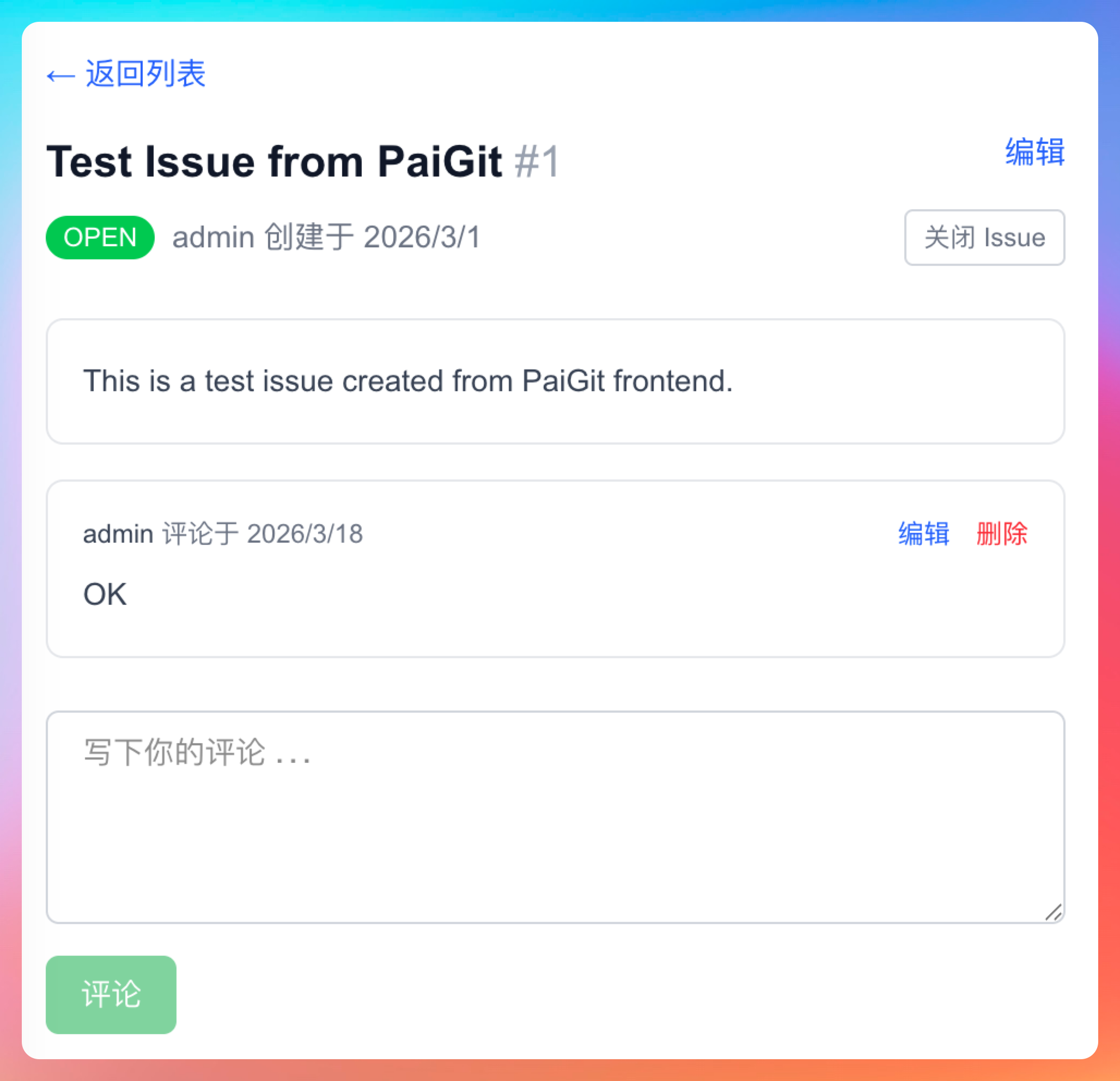 Issue 编辑和评论管理 — 完全正常。Issue 详情页右上角新增了「编辑」按钮,支持内联编辑标题和内容。评论区每条评论旁有「编辑」和「删除」链接(仅作者/管理员可见),删除有确认对话框,防止误操作。