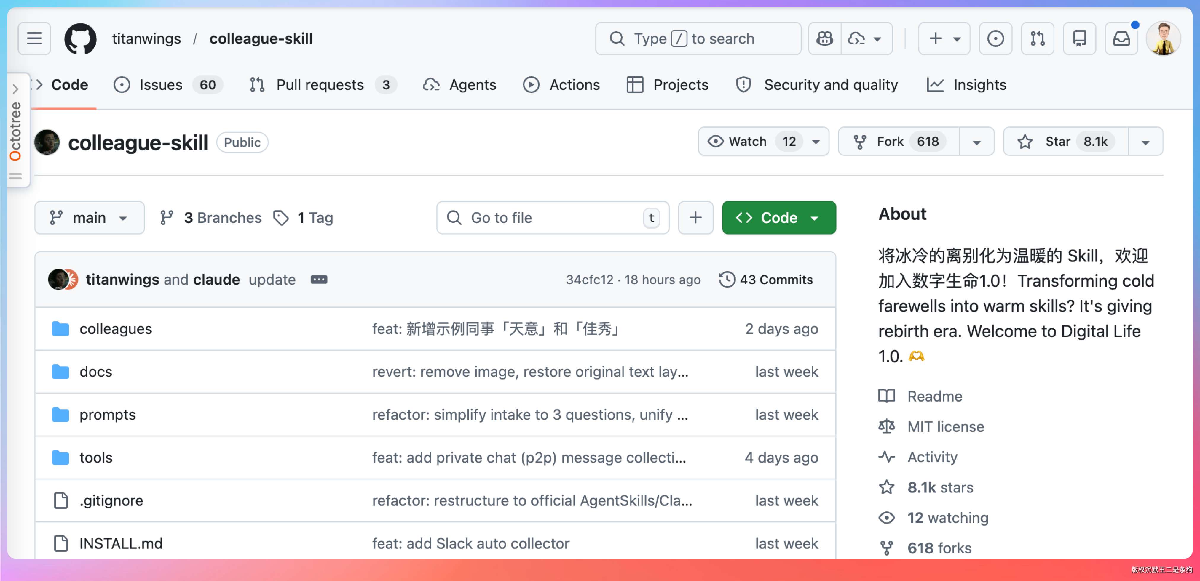 名字叫「同事.skill」,上线 5 天,8.1k Star。