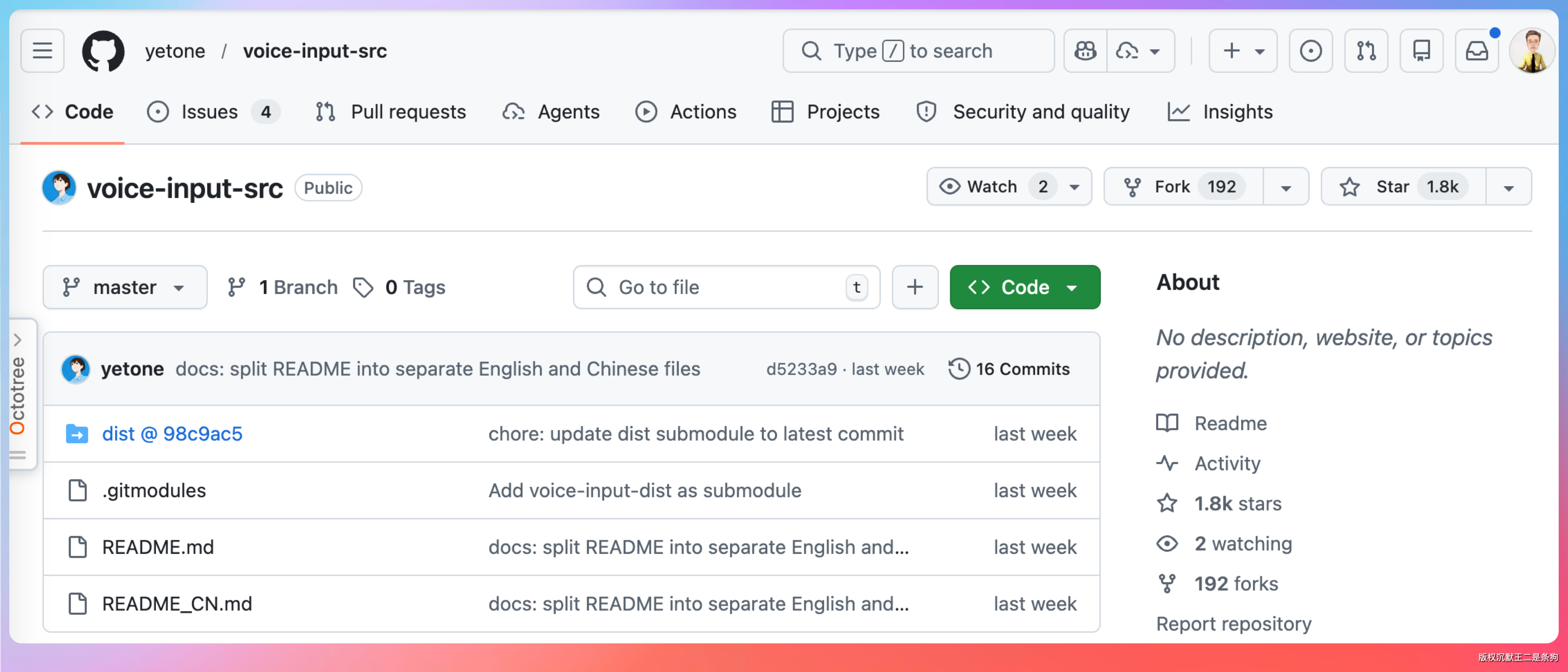 voice-input-src(1.8k Star):前面提到过,只有一段提示词的 macOS 语音输入应用。作者开源的是「如何用 AI 生成一个 macOS 应用」的方法论,而不是应用本身。
