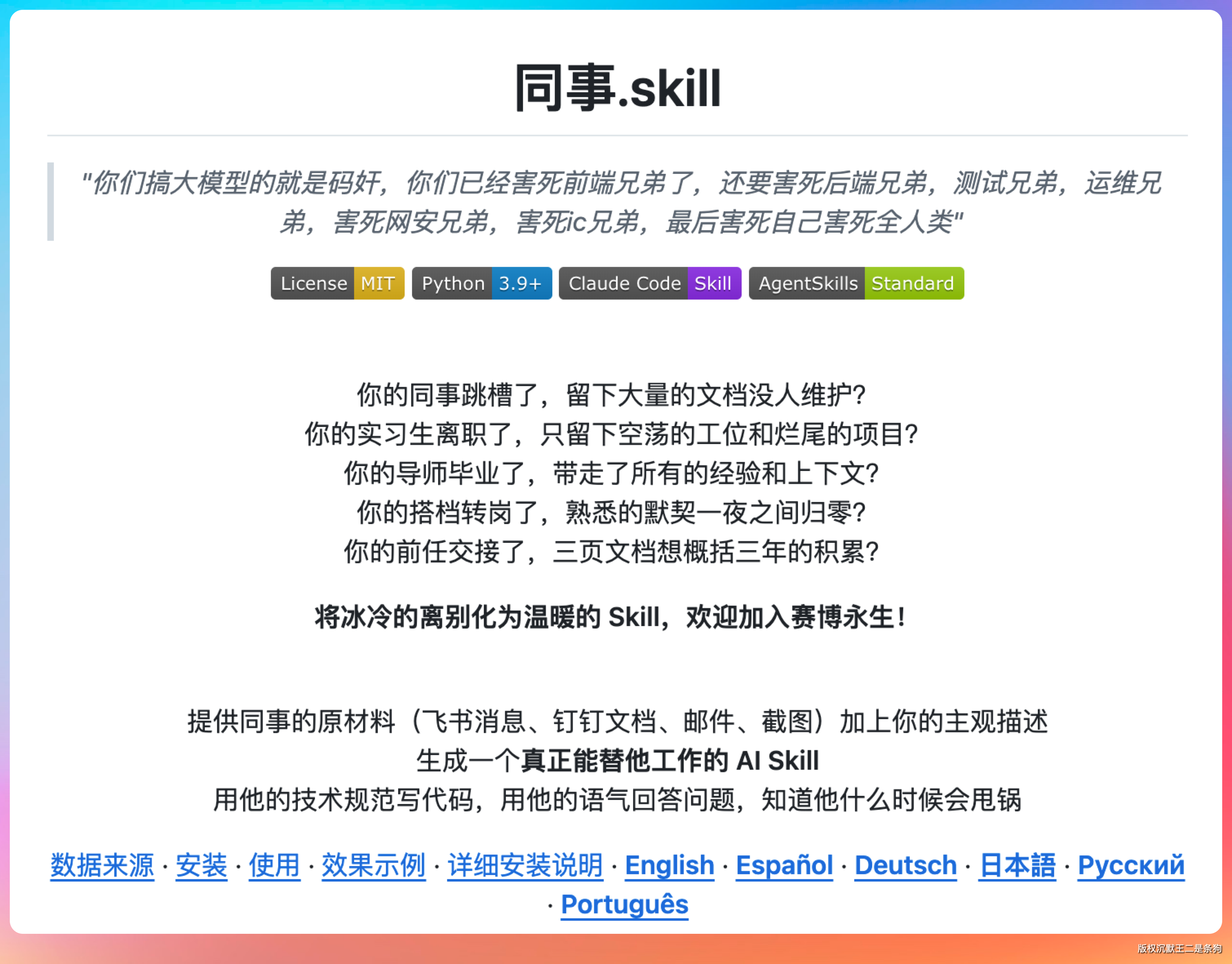 功能是把离职同事的飞书消息、文档、邮件、甚至微信聊天记录喂给 AI,生成一个 Skill。装上之后,AI 就能用这位同事的风格写代码、用他的语气回消息,甚至知道他啥时候会甩锅。