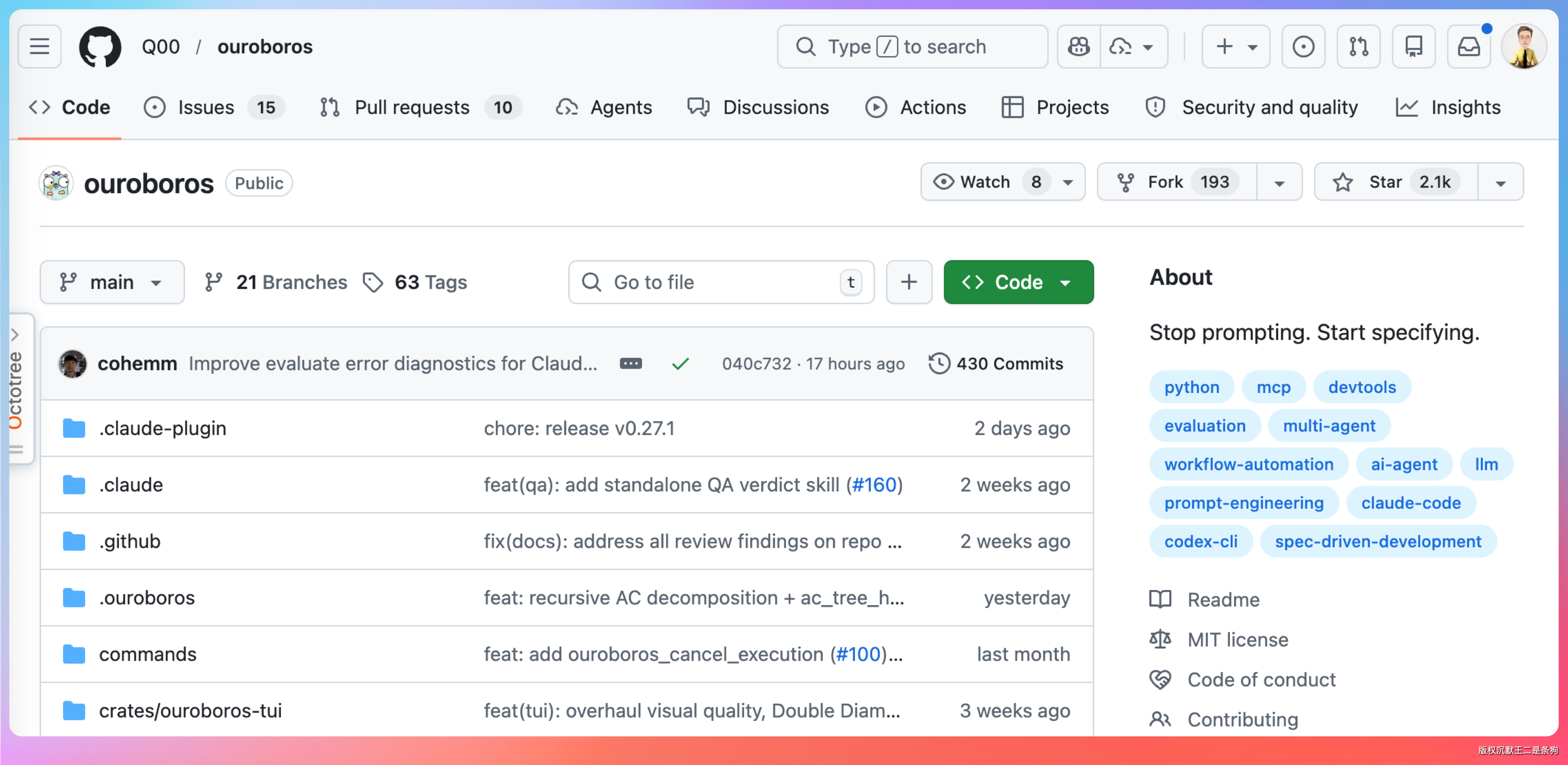 传统开源项目的迭代依赖社区贡献,需要人写 PR、review 代码、合并分支。而 Ouroboros 展示了一种新模式:开源一个初始版本,然后让 AI 自己迭代,社区只需要观察和引导。