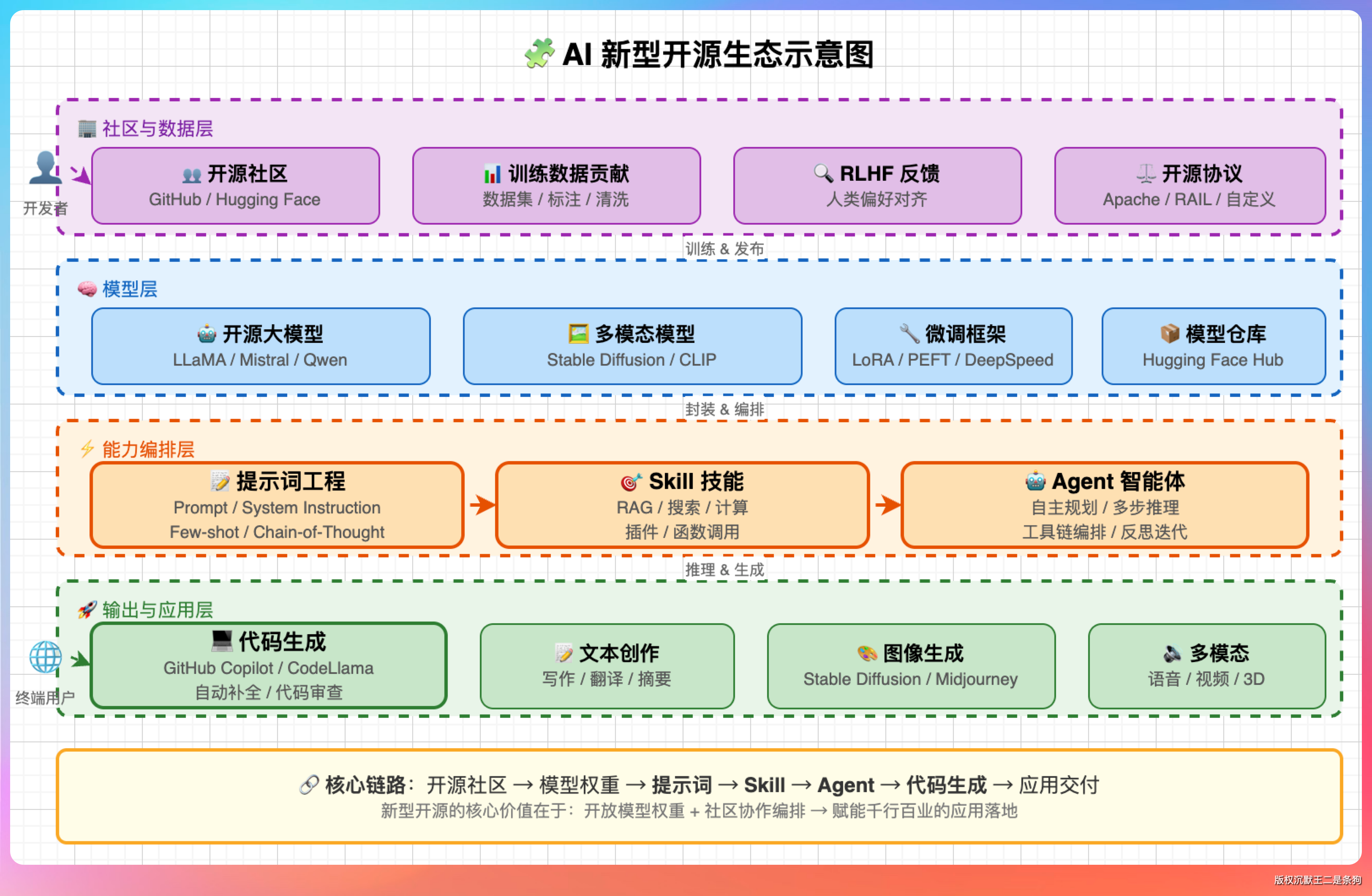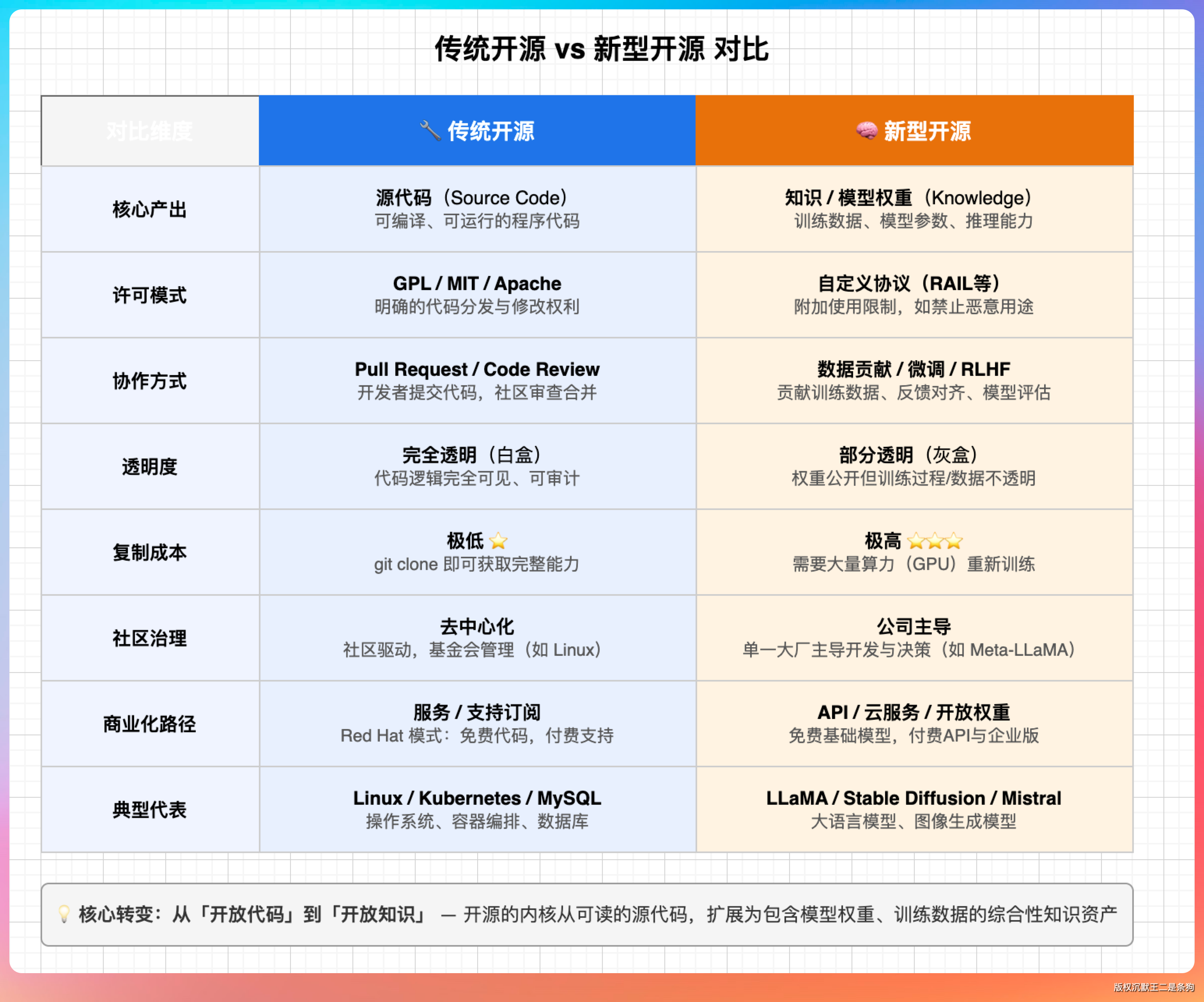 新型开源:开的是知识。价值在于「可复现、可迁移、可组合」。贡献方式是改进提示词、分享使用经验、提出新思路。成功指标同样可以是 Star 数,但更多是「影响力」——有多少人用了你的方法、衍生出了多少变种。