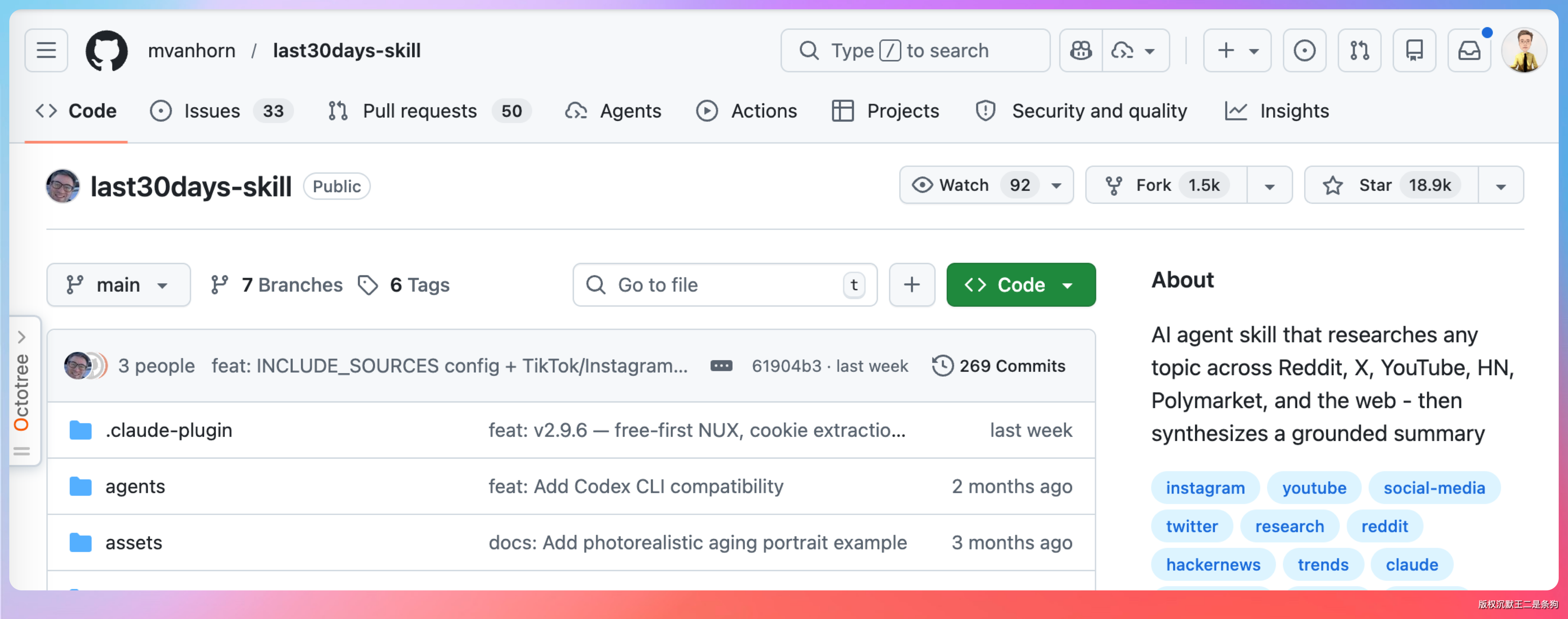 last30days-skill(18.9k Star):一个 AI Agent 研究技能,能自动调研 Reddit、X、YouTube、HN 等平台,然后合成一份有依据的总结报告。开源的是一个 Skill 文件,不是代码库。
