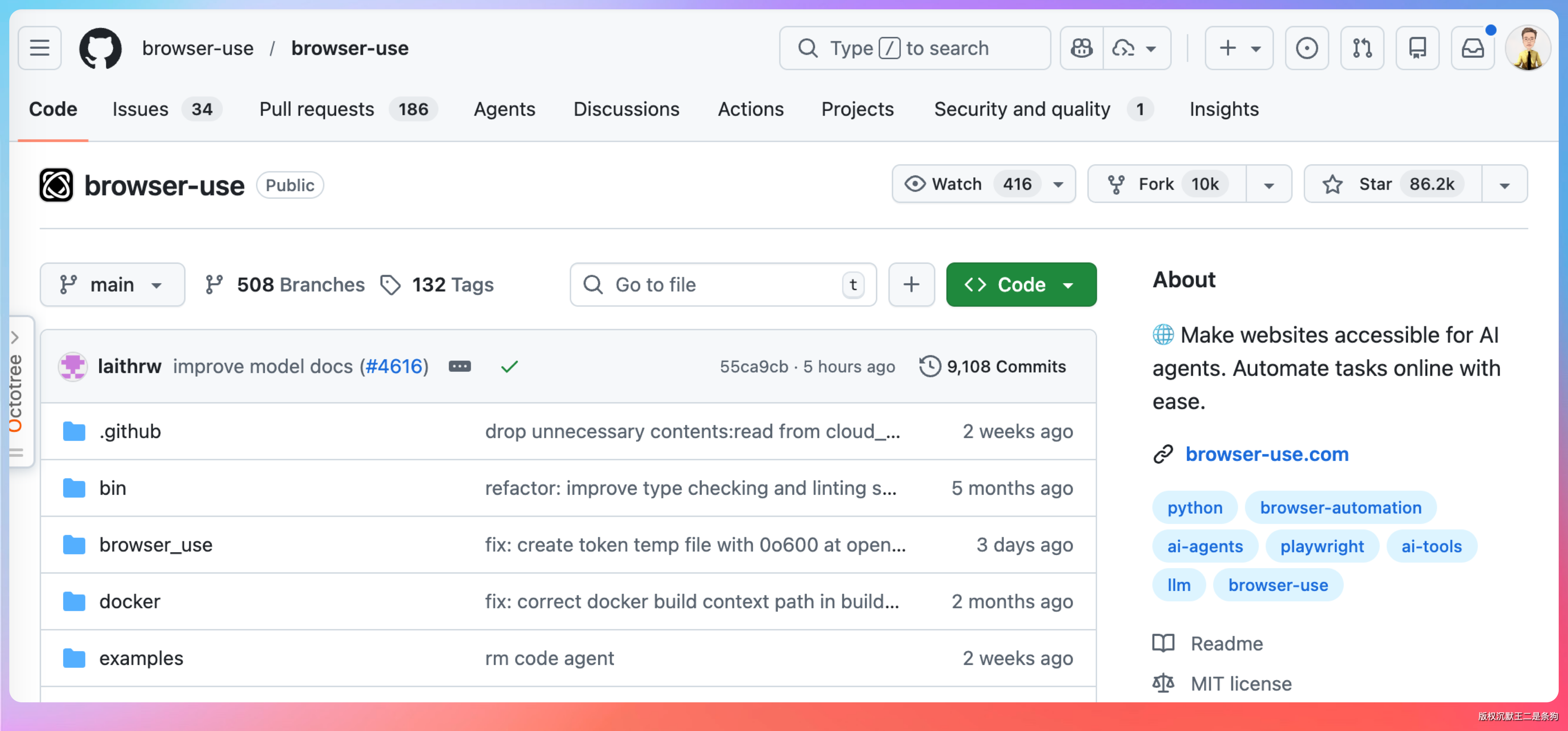 browser-use(86k Star):让 AI 能操作浏览器的框架。核心价值是一套提示词和工具定义,让任何 Agent 都能获得浏览器自动化能力。