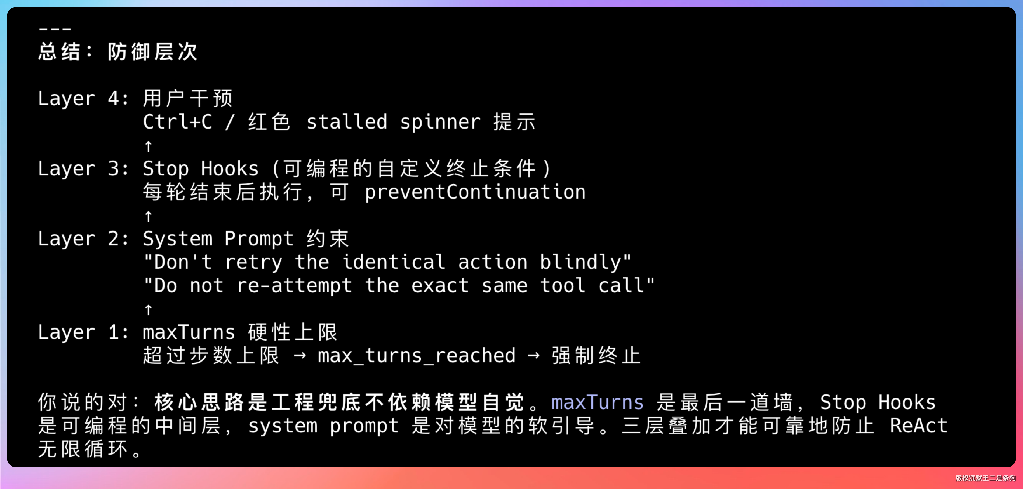 ReAct 循环有个经典的风险叫「无限循环」——模型判断任务没完成,一直尝试,一直失败,一直再尝试,token 烧完了任务还没结果。