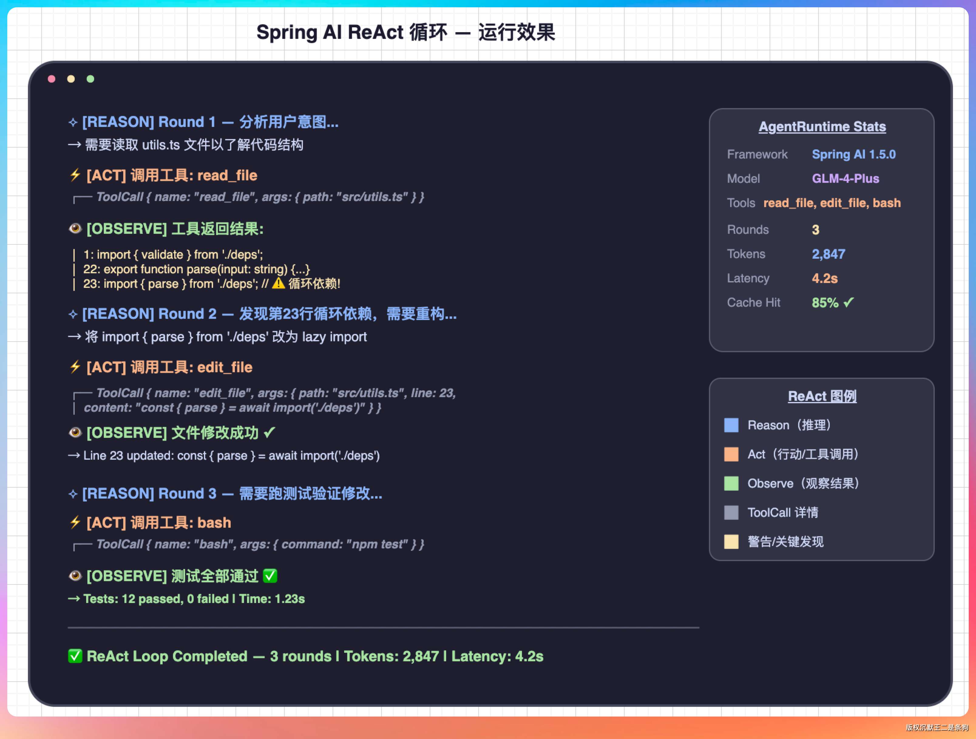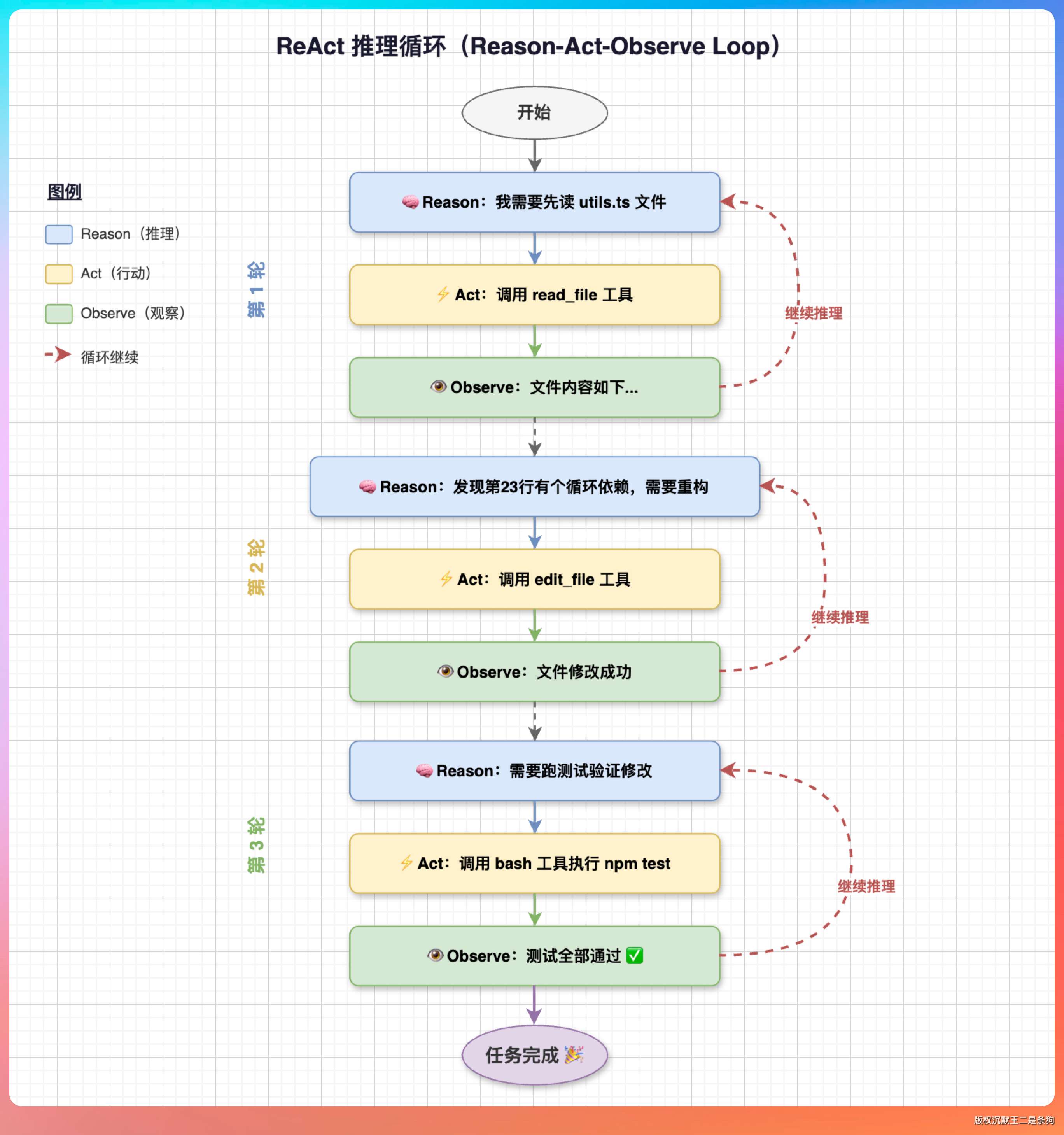 ReAct 循环调度——主循环控制整个推理-行动-观察的节奏: