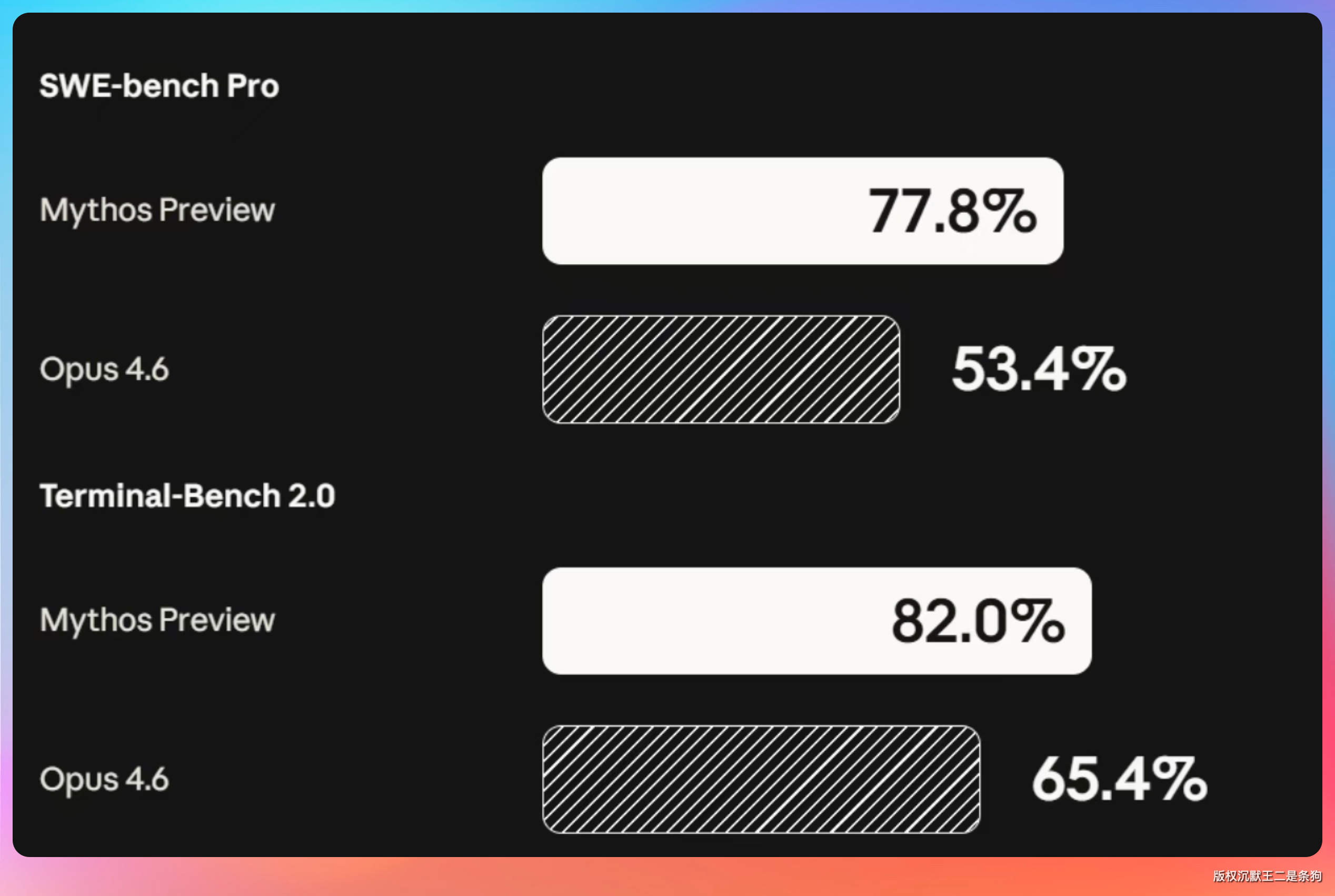 Mythos 在 SWE-bench Pro 上打出了 77.8% 的高分,在终端和代码任务上几乎碾压了所有对手。