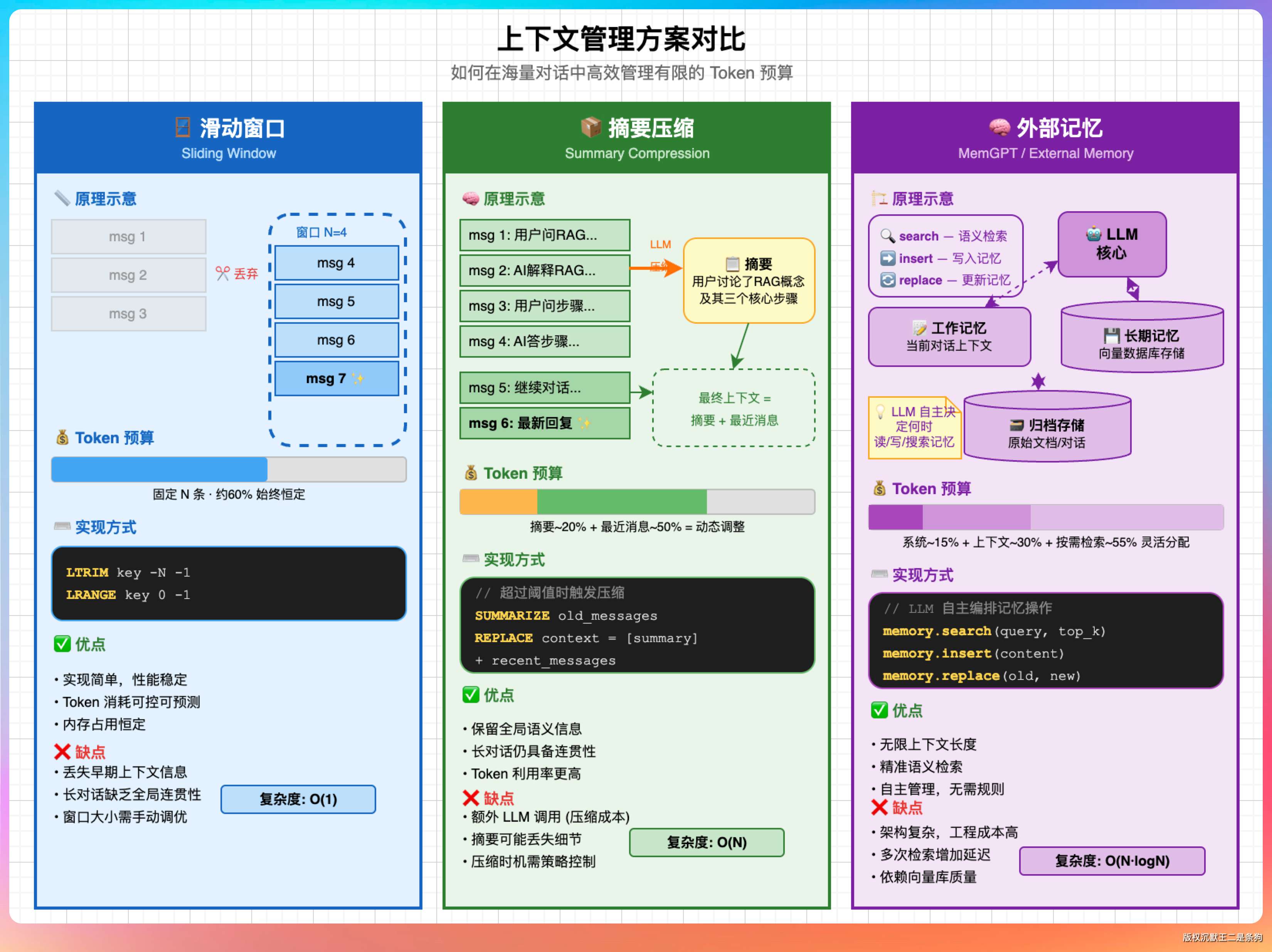 方案三:外部记忆(External Memory)。把重要信息(比如用户偏好、关键事实)单独存到一个「记忆库」里,每次对话时先从记忆库里检索相关信息拼入 prompt,类似于 RAG 的思路。MemGPT、LangChain 的 Memory 模块都有这种实现。