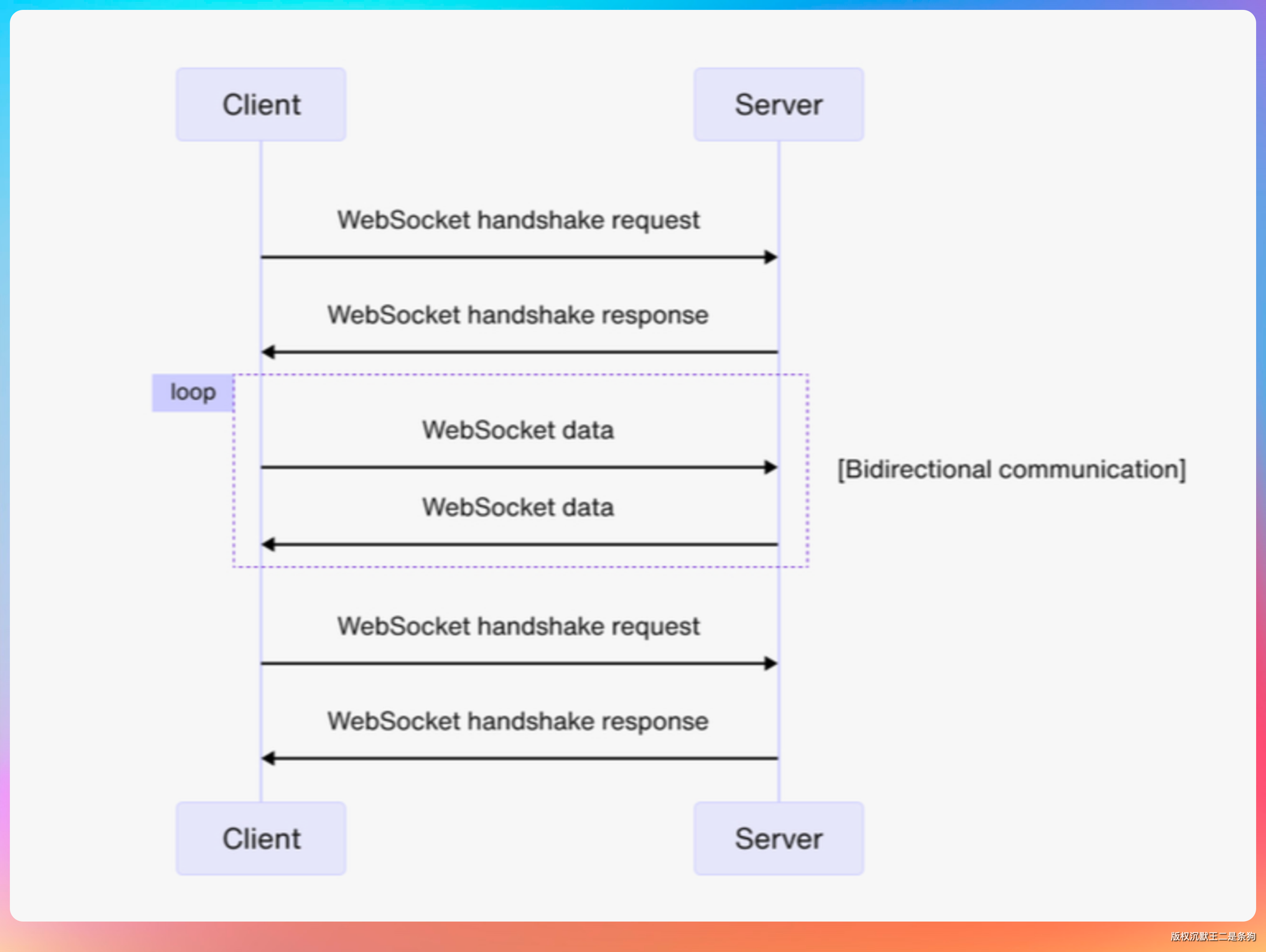 - 之后这个 TCP 连接就不再走 HTTP 协议,而是走 WebSocket 帧协议,实现全双工通信。
