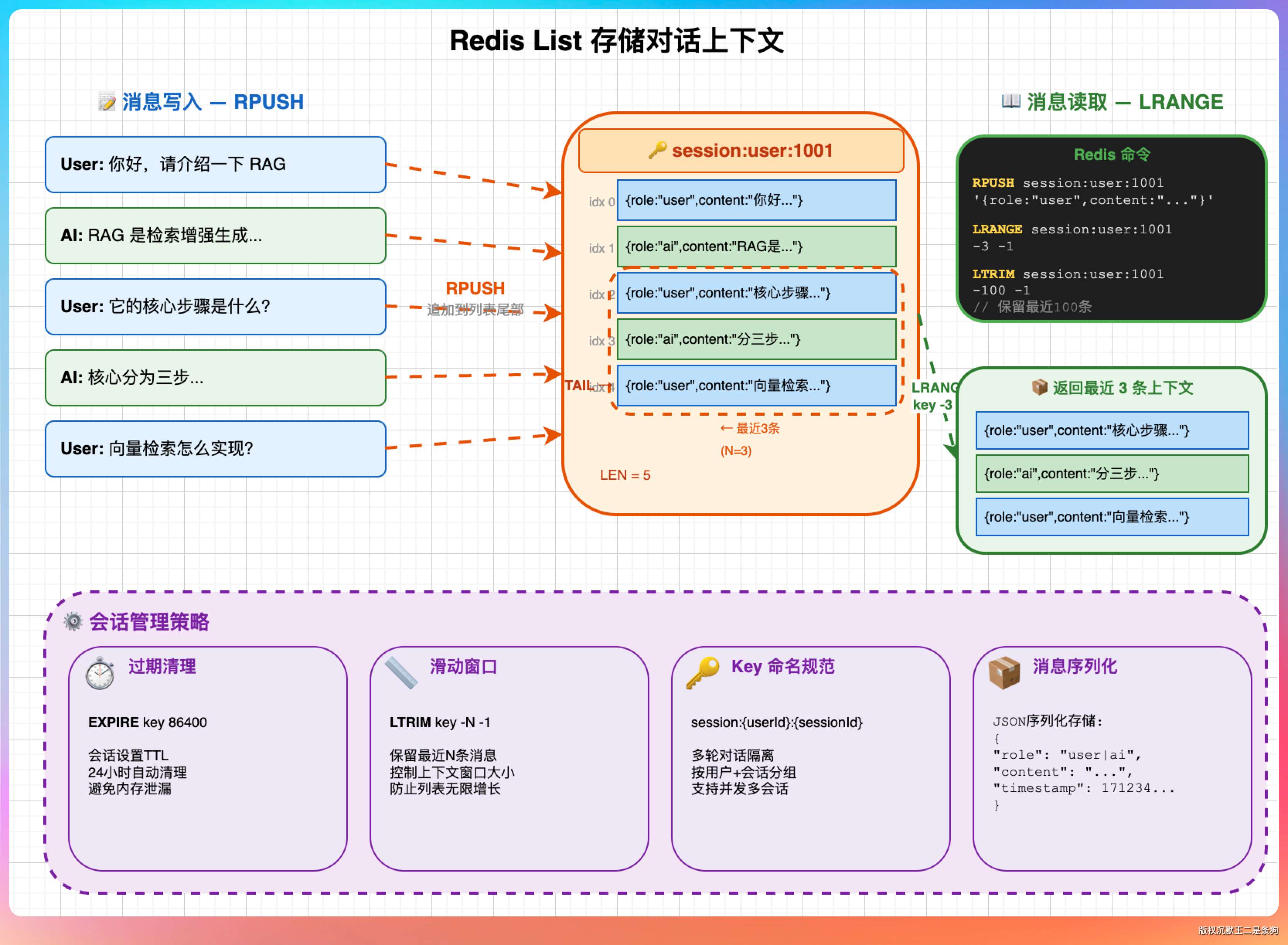 读取时用 LRANGE key 0 -1 取出所有消息,或者 LRANGE key -20 -1 取最近 10 轮(20 条,因为一轮包含 user 和 assistant 各一条)。