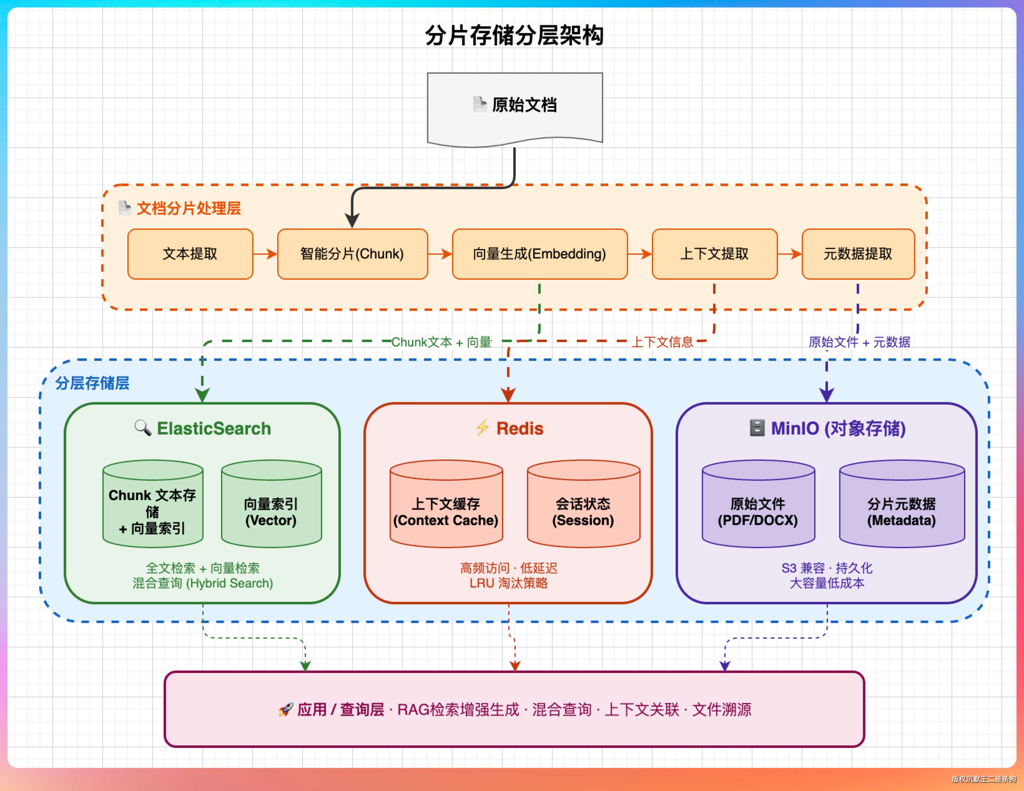 存储选择。原始 chunk 文本和向量存在 ES,对话上下文存在 Redis,文件本身存在对象存储(比如 MinIO 或者云存储),各司其职。