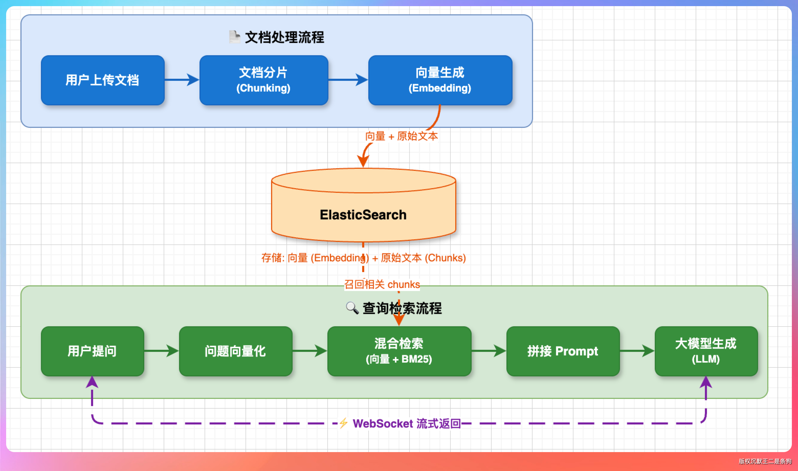 用户提问时,系统对问题向量化,在 ES 中执行混合检索(向量检索 + BM25 关键词检索),把召回的相关 chunk 拼接进 prompt,交给大模型生成答案,最后通过 WebSocket 流式返回给前端。
