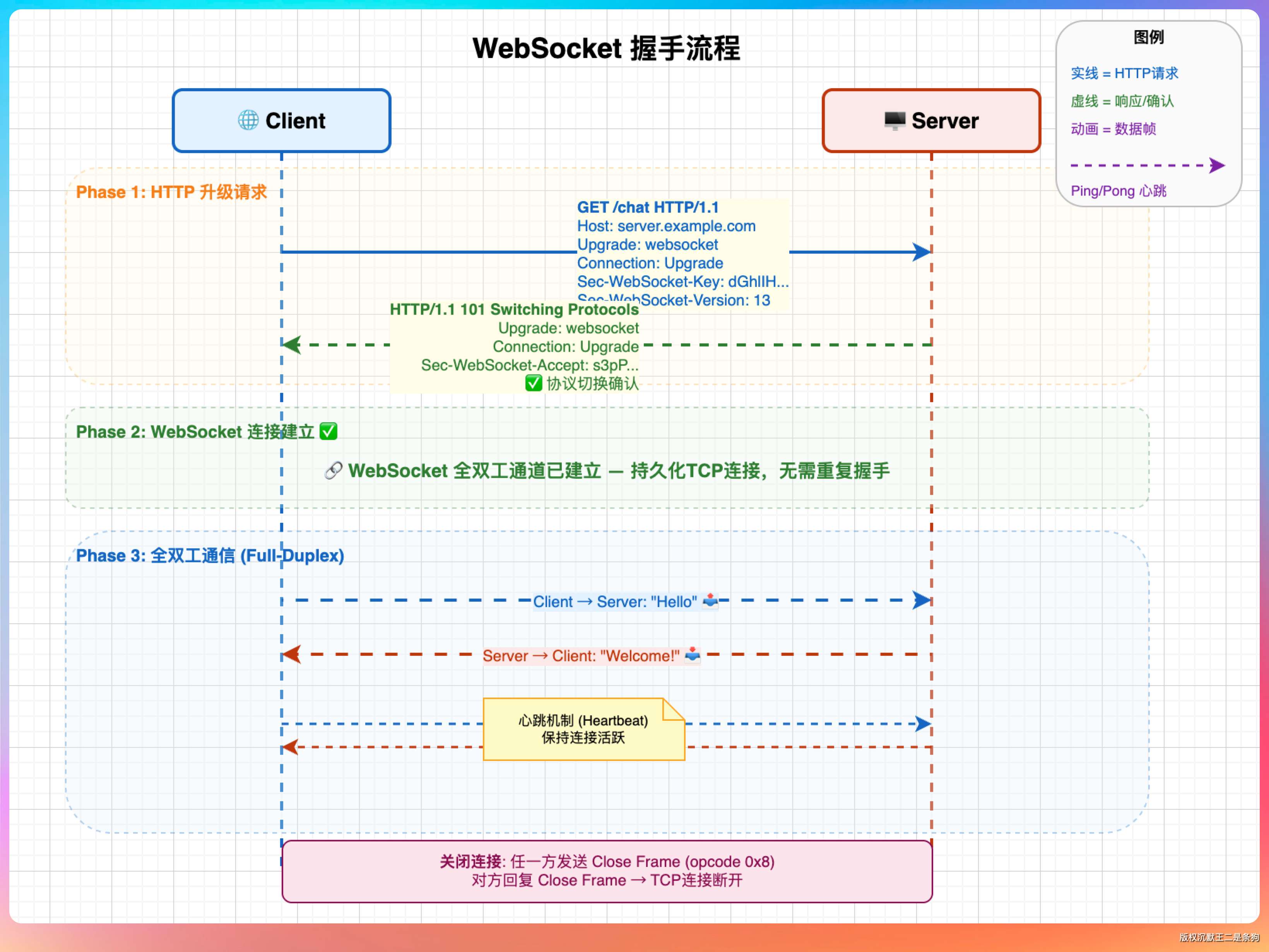 Upgrade: websocket和Connection: Upgrade头。 - 服务端返回 101 Switching Protocols,表示同意升级。