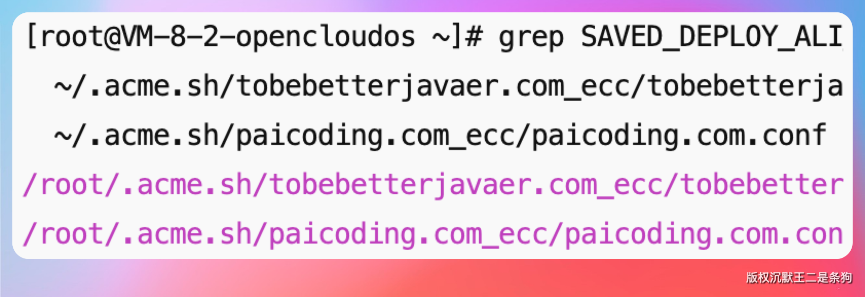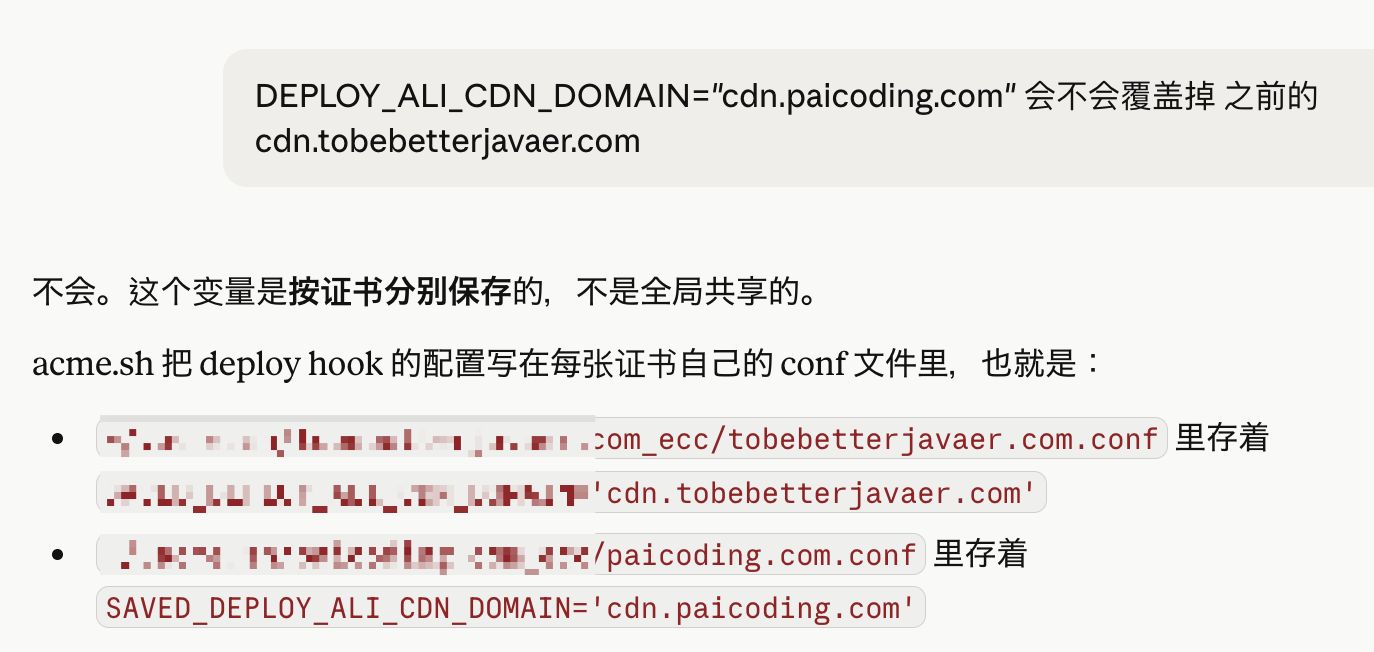 Claude 说这是之前签证书时留下的残留索引,实际上磁盘里只有一份证书(就是 paicoding.com_ecc 那个),这条残留可以用 acme.sh --remove -d '*.paicoding.com' --ecc 清理掉,不影响正常使用。
