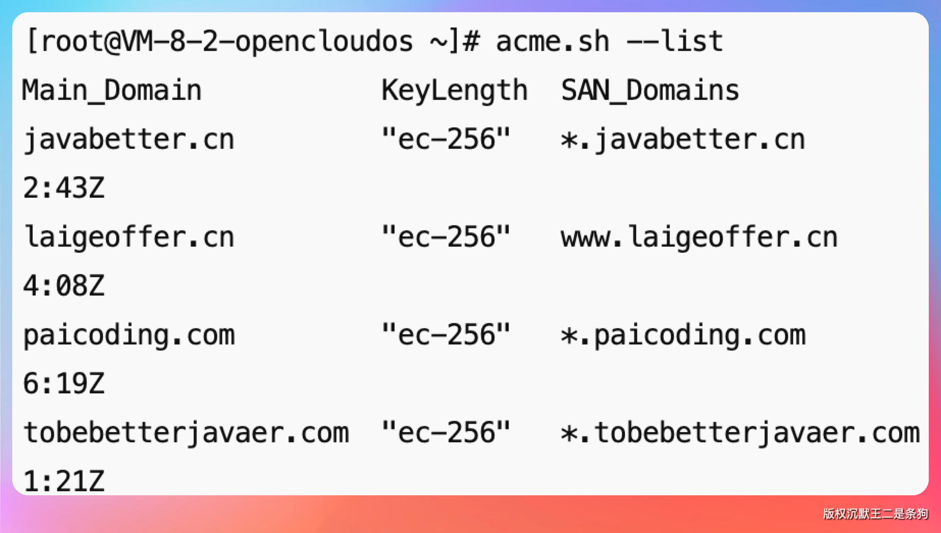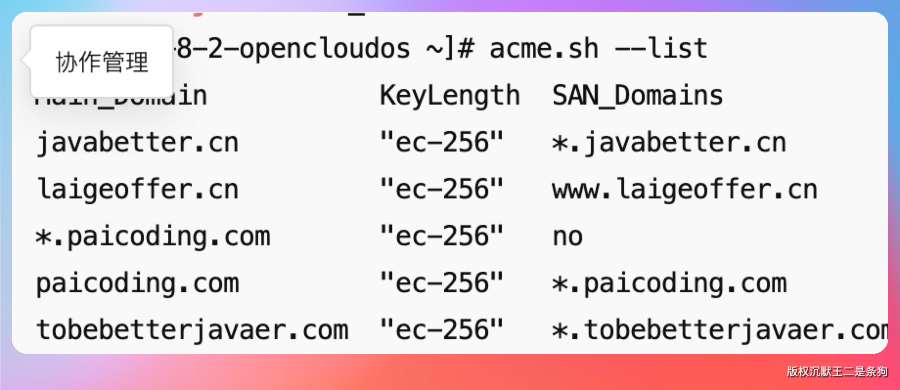 顺便提一下,我在 acme.sh --list 里还发现了一条诡异的记录——*.paicoding.com 单独有一行,SAN 显示 no。