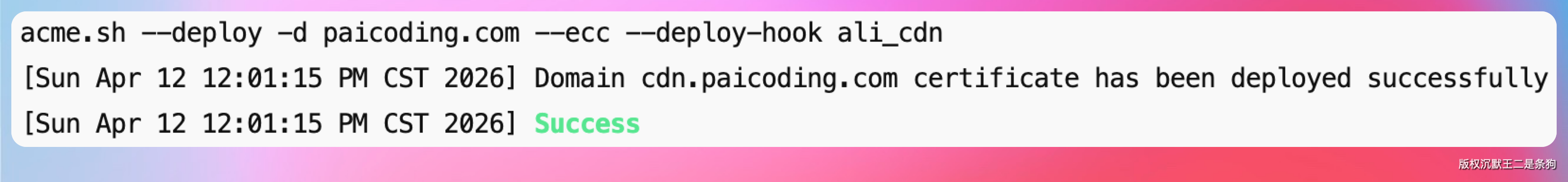 acme.sh --deploy -d paicoding.com --ecc --deploy-hook ali_cdn