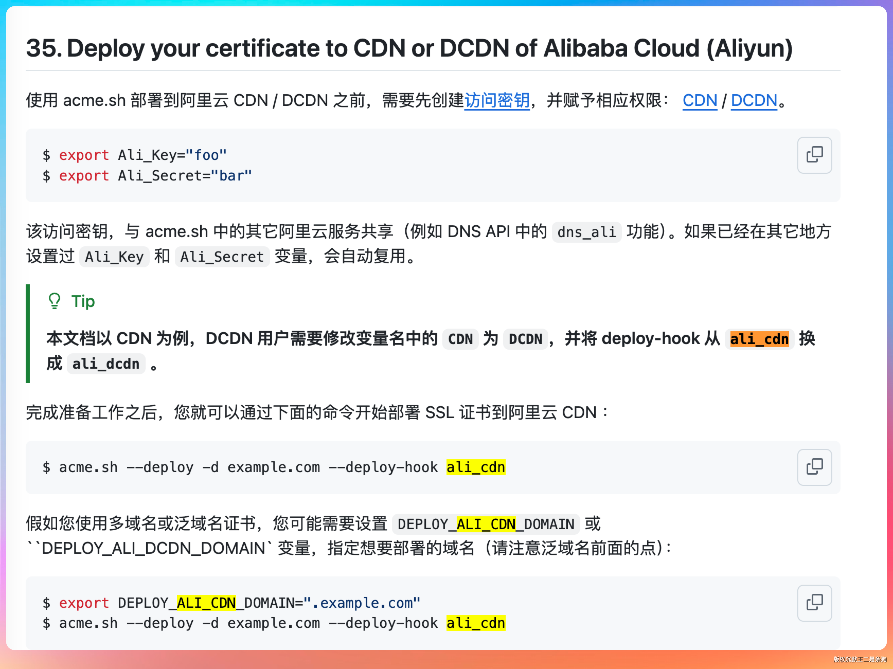 acme.sh 内置了几十种 deploy hook,覆盖了主流云服务商。ali_cdn 就是专门给阿里云 CDN 用的。