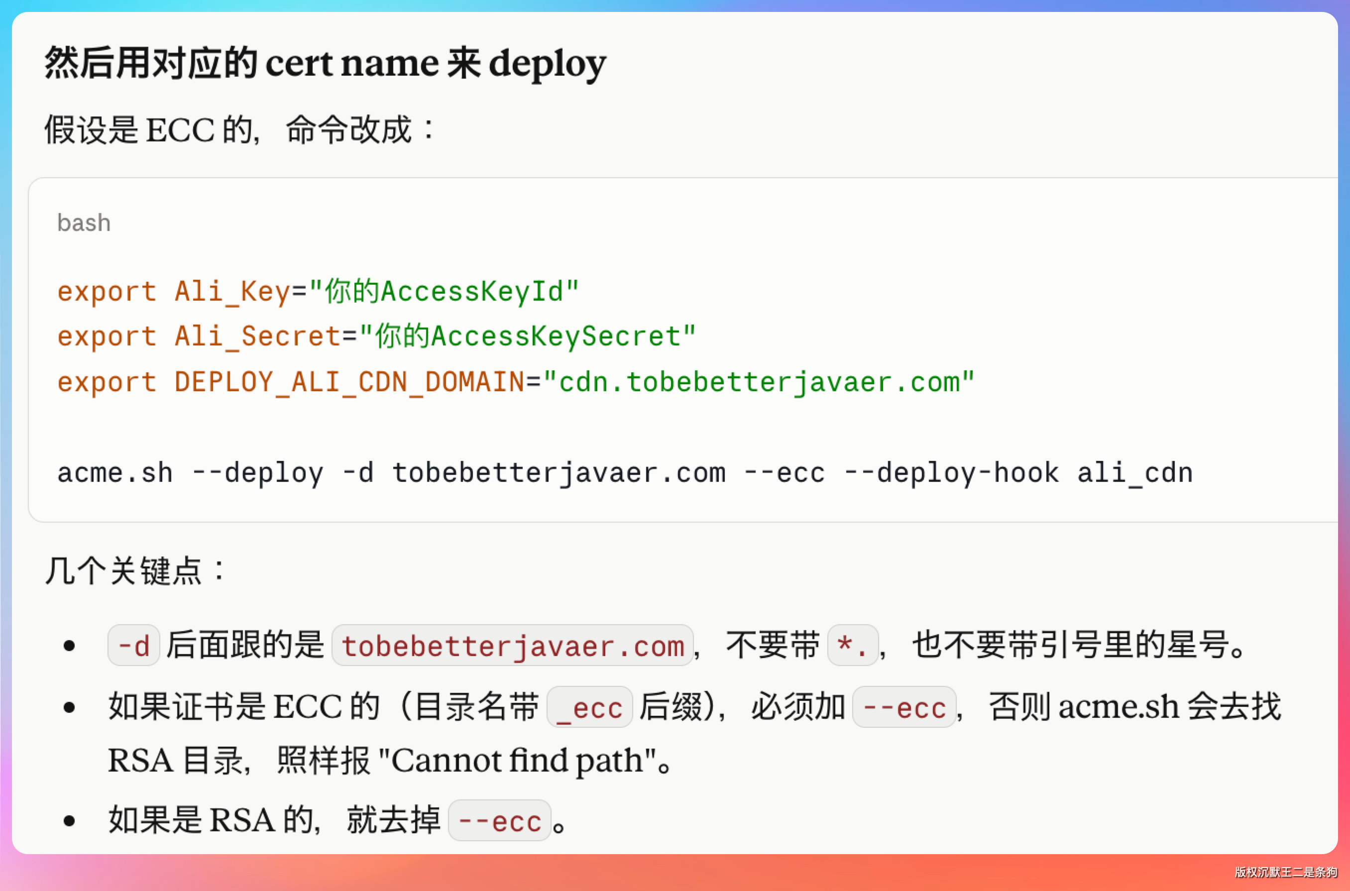 acme.sh --deploy -d tobebetterjavaer.com --ecc --deploy-hook ali_cdn