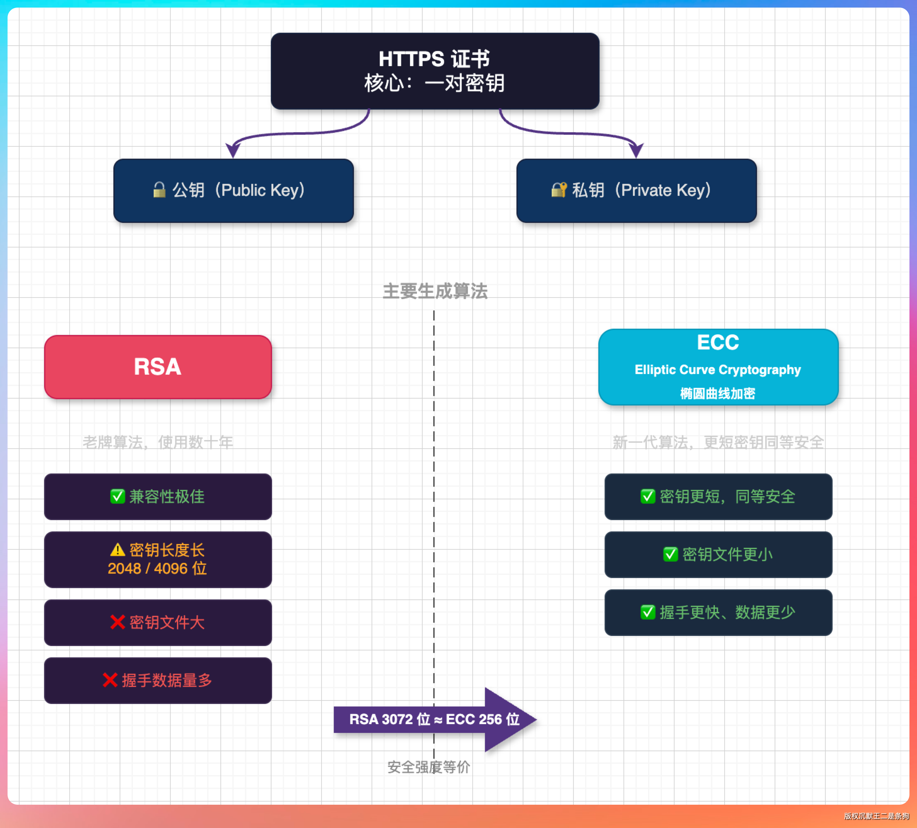 HTTPS 证书的核心是一对密钥——公钥和私钥。生成密钥的算法主要有两种:RSA 和 ECC。