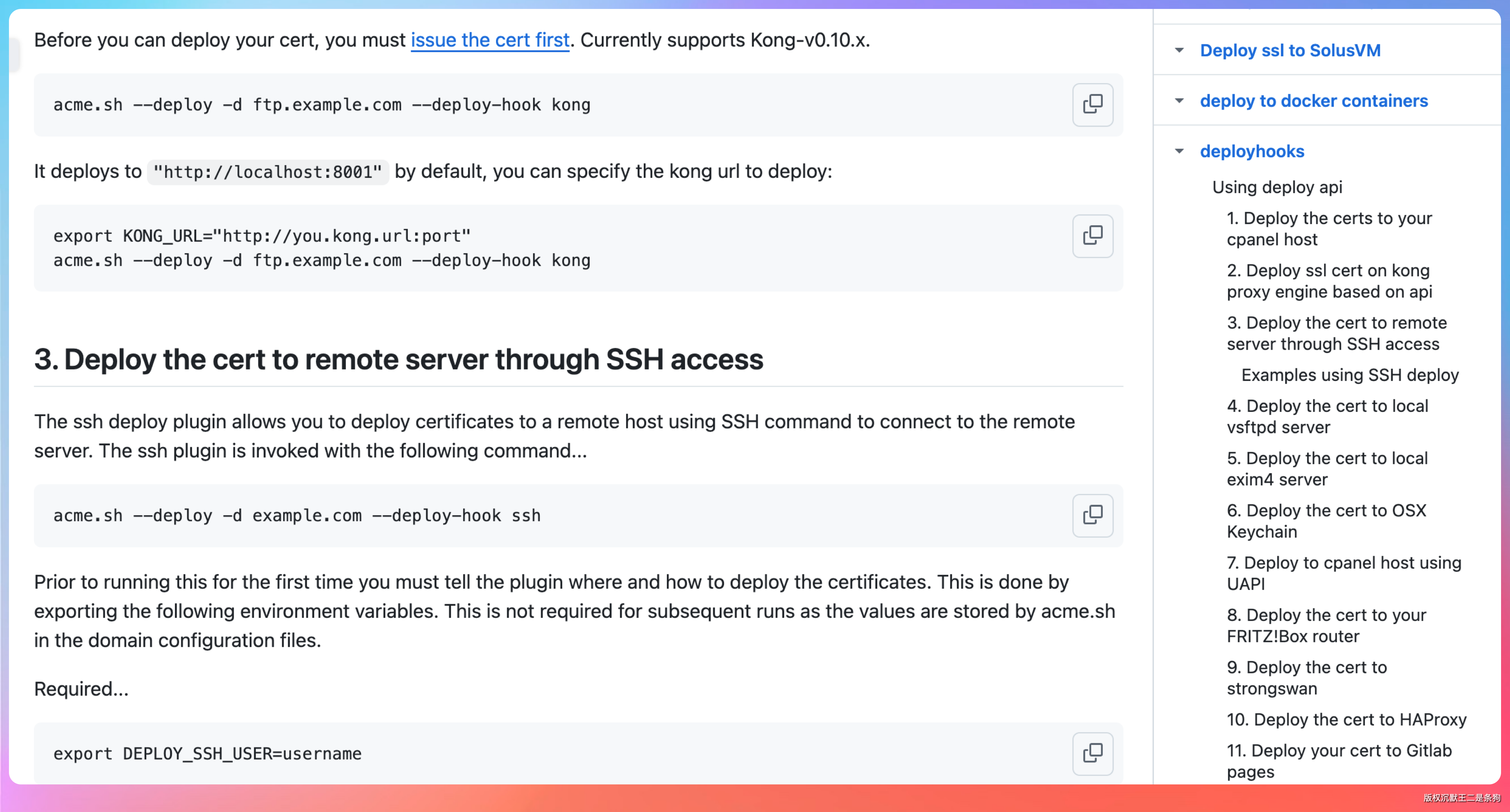 而如果我自己去 acme.sh 的 wiki 翻文档,可能半小时都找不到——因为我一开始就不知道应该搜“deploy hook”这个关键词,我脑子里的方案是“浏览器操作阿里云控制台”。