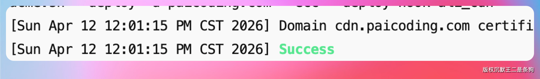 一样是秒过。Domain cdn.paicoding.com certificate has been deployed successfully,熟悉的成功提示。