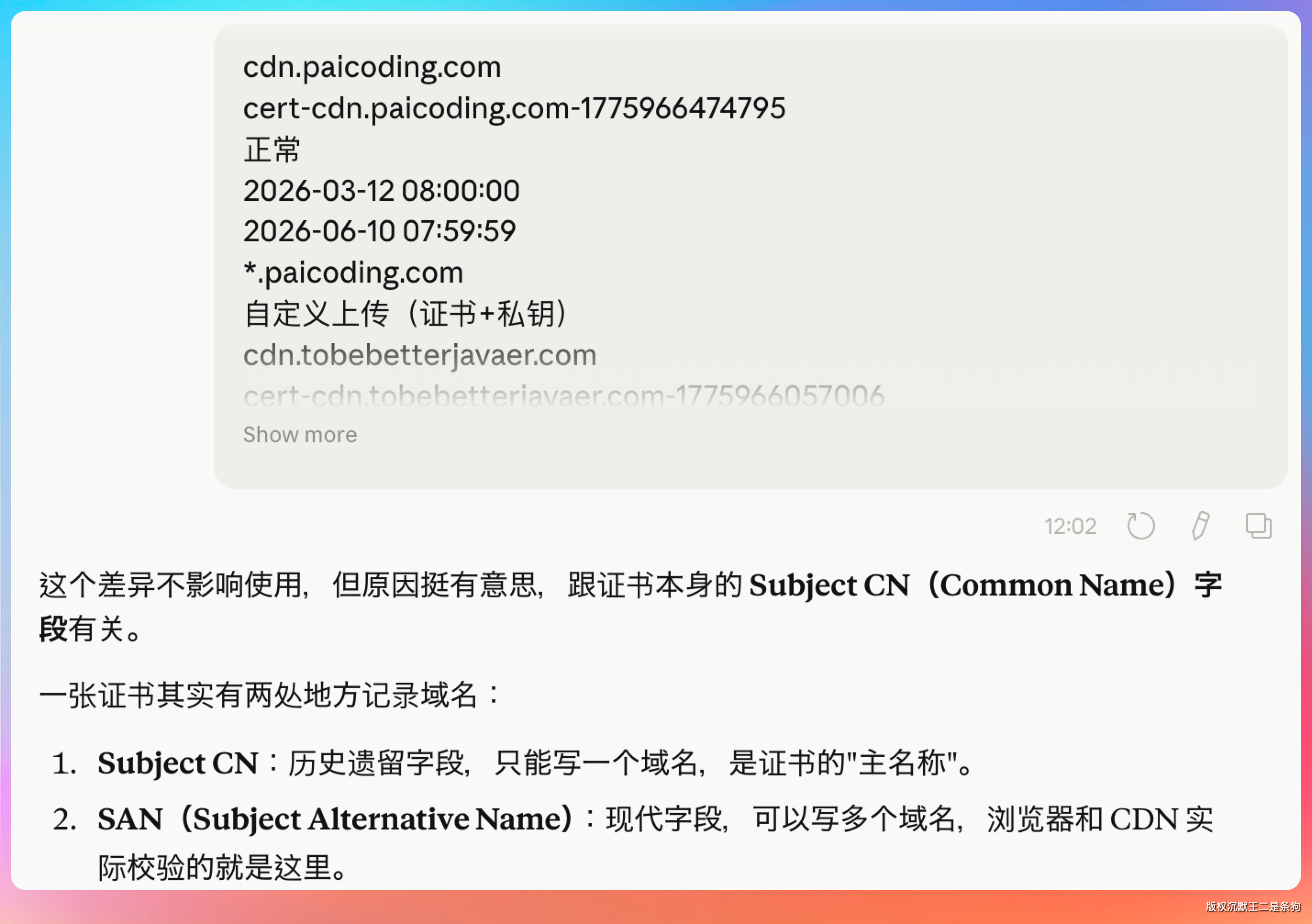 自己翻文档可能翻半天也找不到答案,因为 Subject CN 这东西在 HTTPS 的普及教程里很少被提到,它更多是 PKI(公钥基础设施)领域的概念。但对我们这些实际操作的人来说,控制台上突然出现一个不一样的主域名,第一反应就是“是不是哪里搞错了”。Claude 这一下子把来龙去脉讲清楚,心里就踏实了。