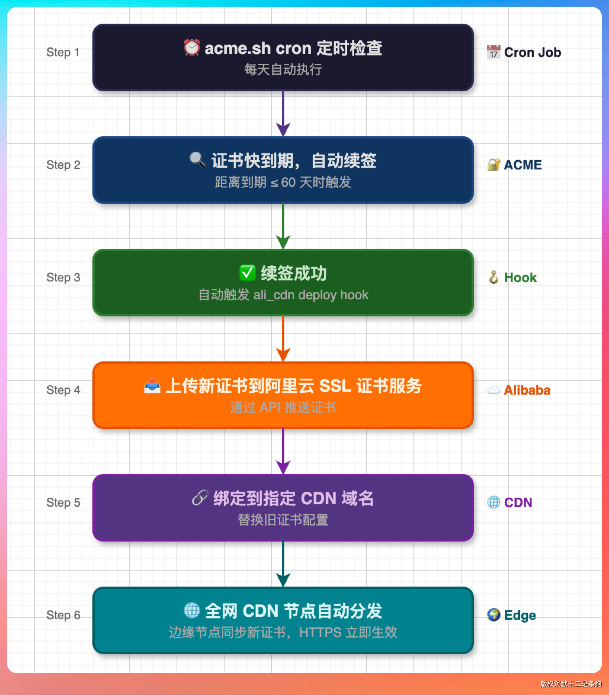 能看到 ali_cdn 就说明已经挂上了。以后 acme.sh 的 cron 每天检查证书,快到期自动续签,续签成功自动把新证书推到阿里云并绑定——全程无人值守。
