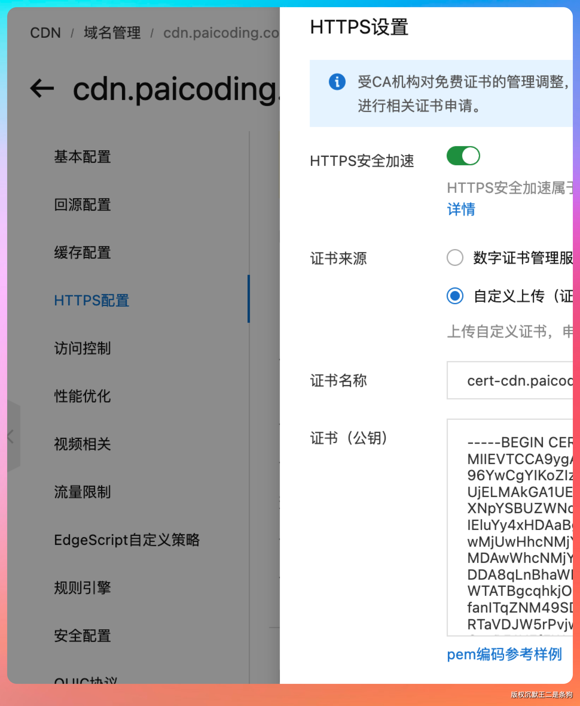 每次的流程是这样的:先登录腾讯云,从服务器上把证书复制出来,然后登录阿里云 CDN 控制台,把证书和密钥贴上去,再绑定到对应的域名。
