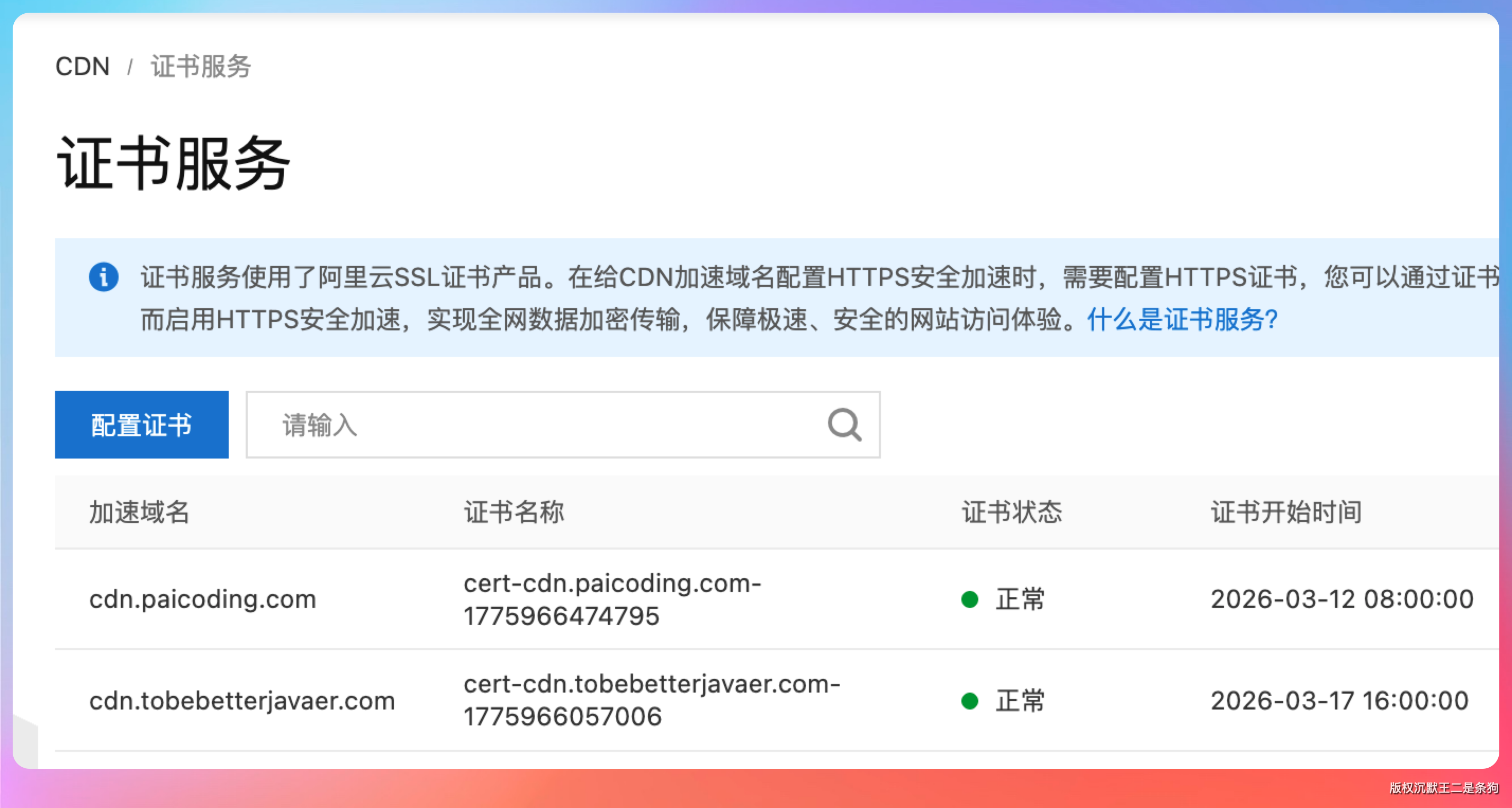 说一下背景。我有两个网站,一个是 javabetter.cn(二哥的 Java 进阶之路),另一个是 paicoding.com(技术派)。图床用的是阿里云 OSS + CDN,访问图片需要走 HTTPS,所以 CDN 上得挂 SSL 证书。