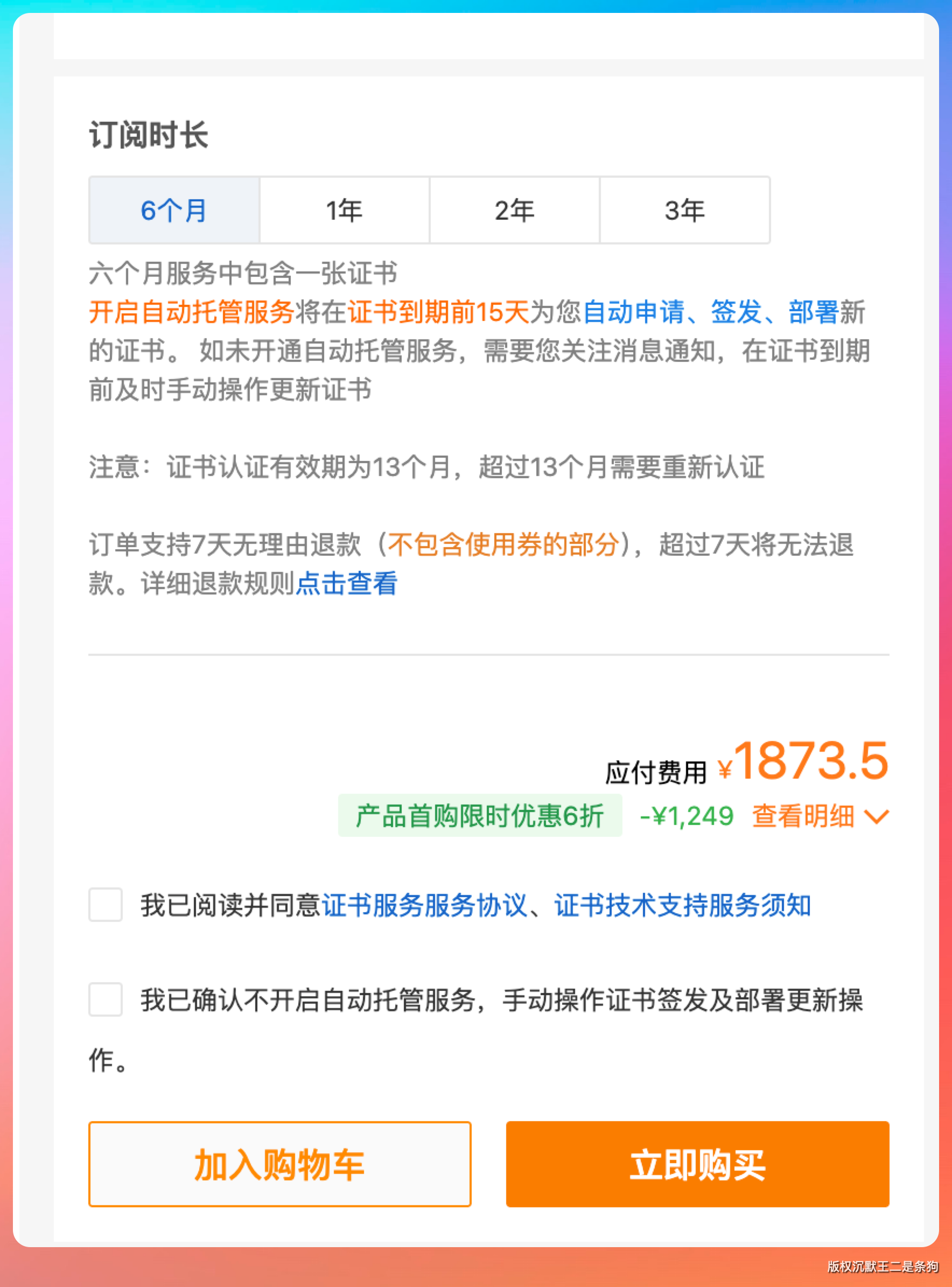 阿里云的商业方案是这样的——一个 SSL 证书 6 个月要 1873.5 元,一个证书托管服务一年 270 元。