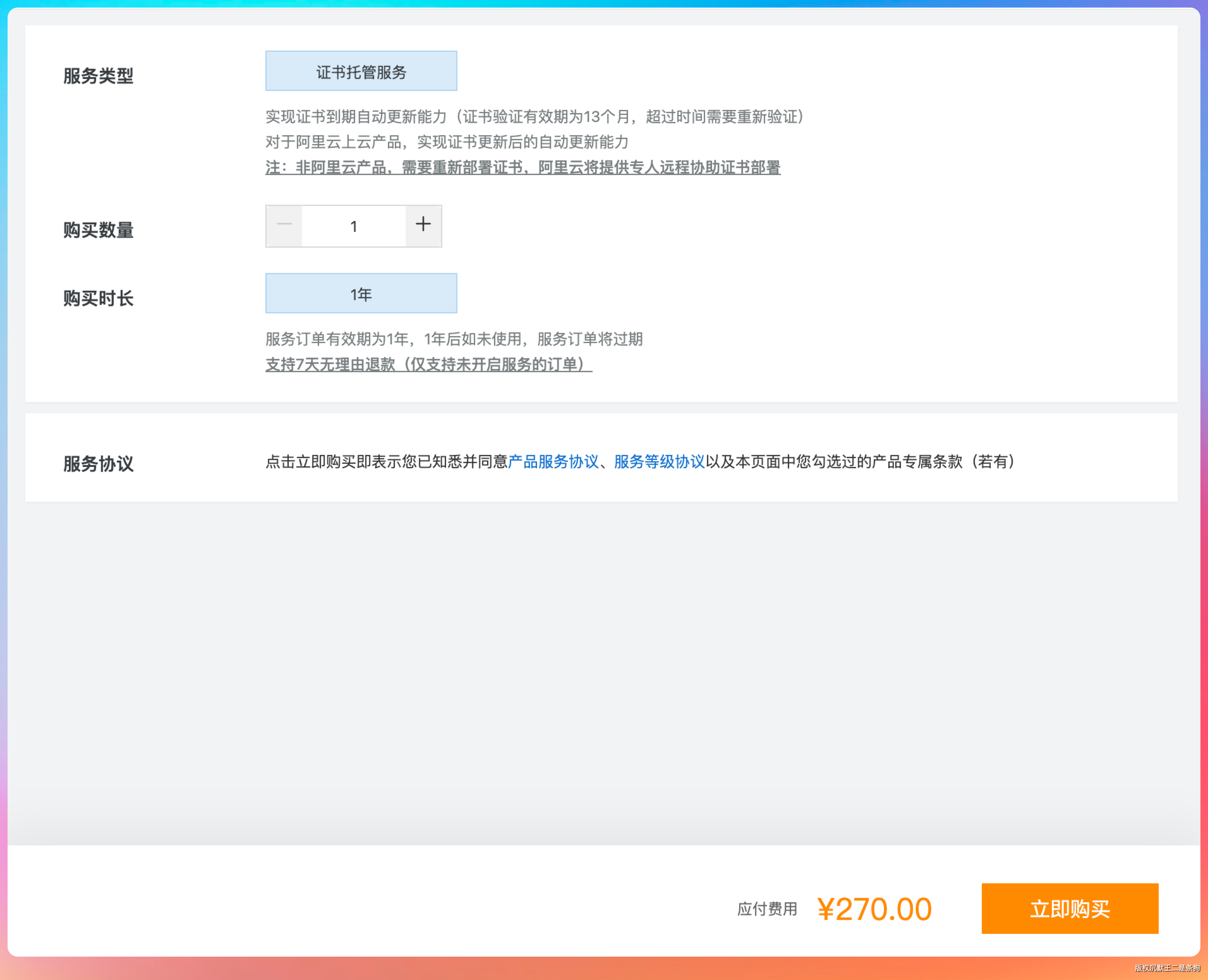 阿里云不会告诉我。它有 SSL 证书的付费服务,一年 270,六个月的证书 1873.5。