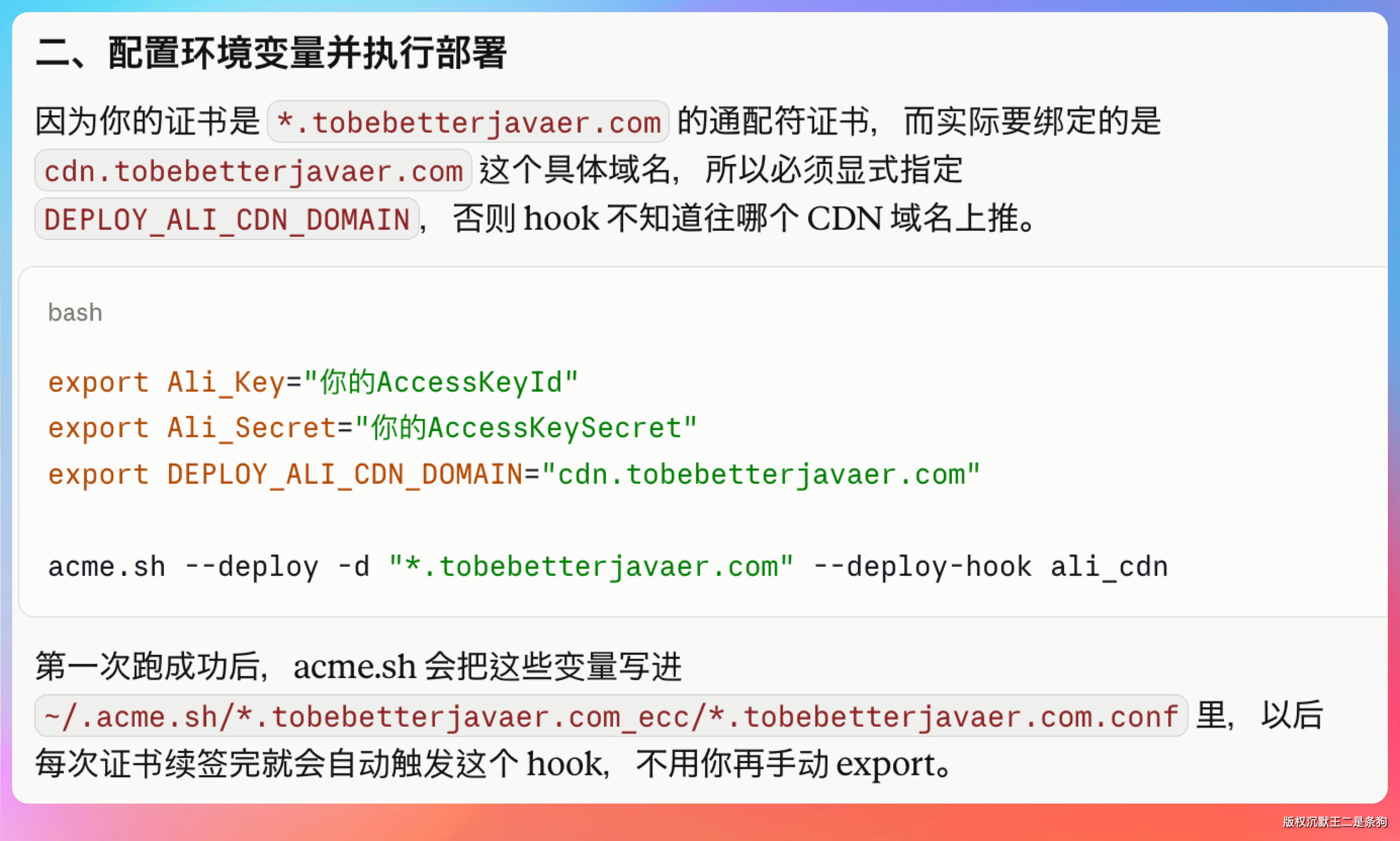 acme.sh --deploy -d "*.tobebetterjavaer.com" --deploy-hook ali_cdn