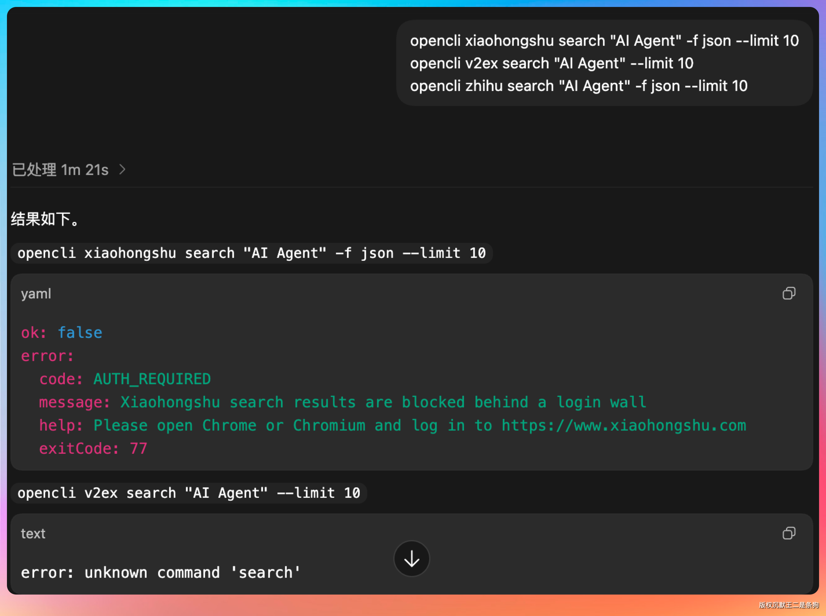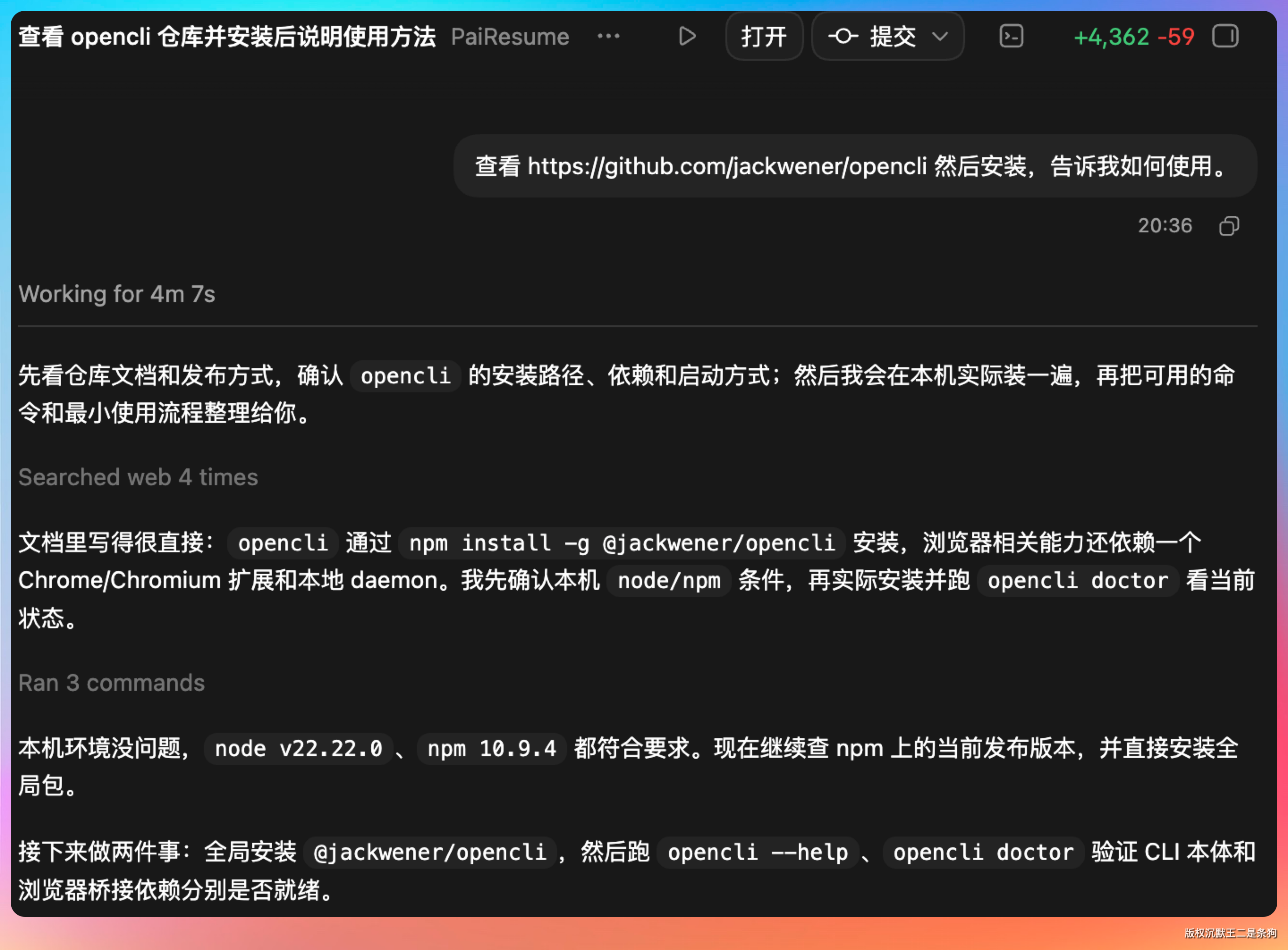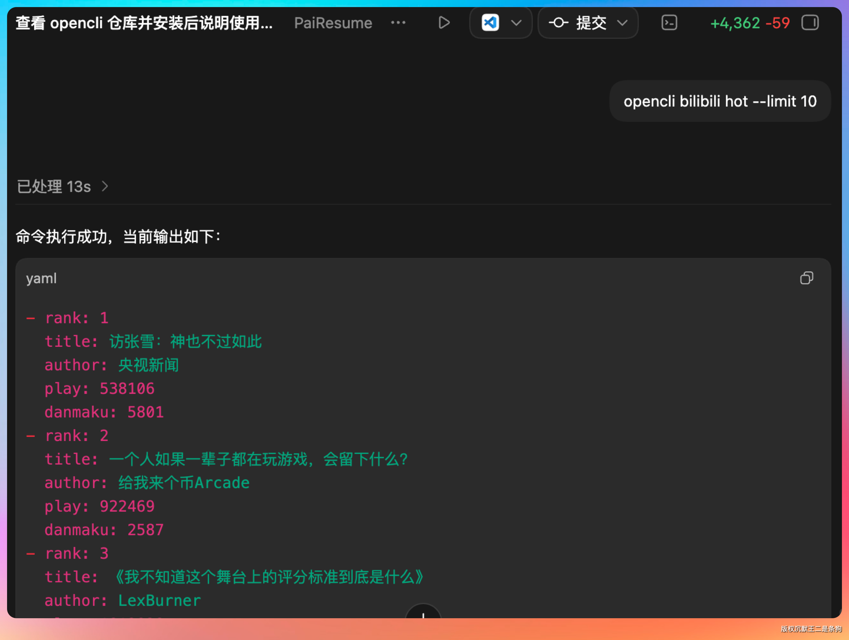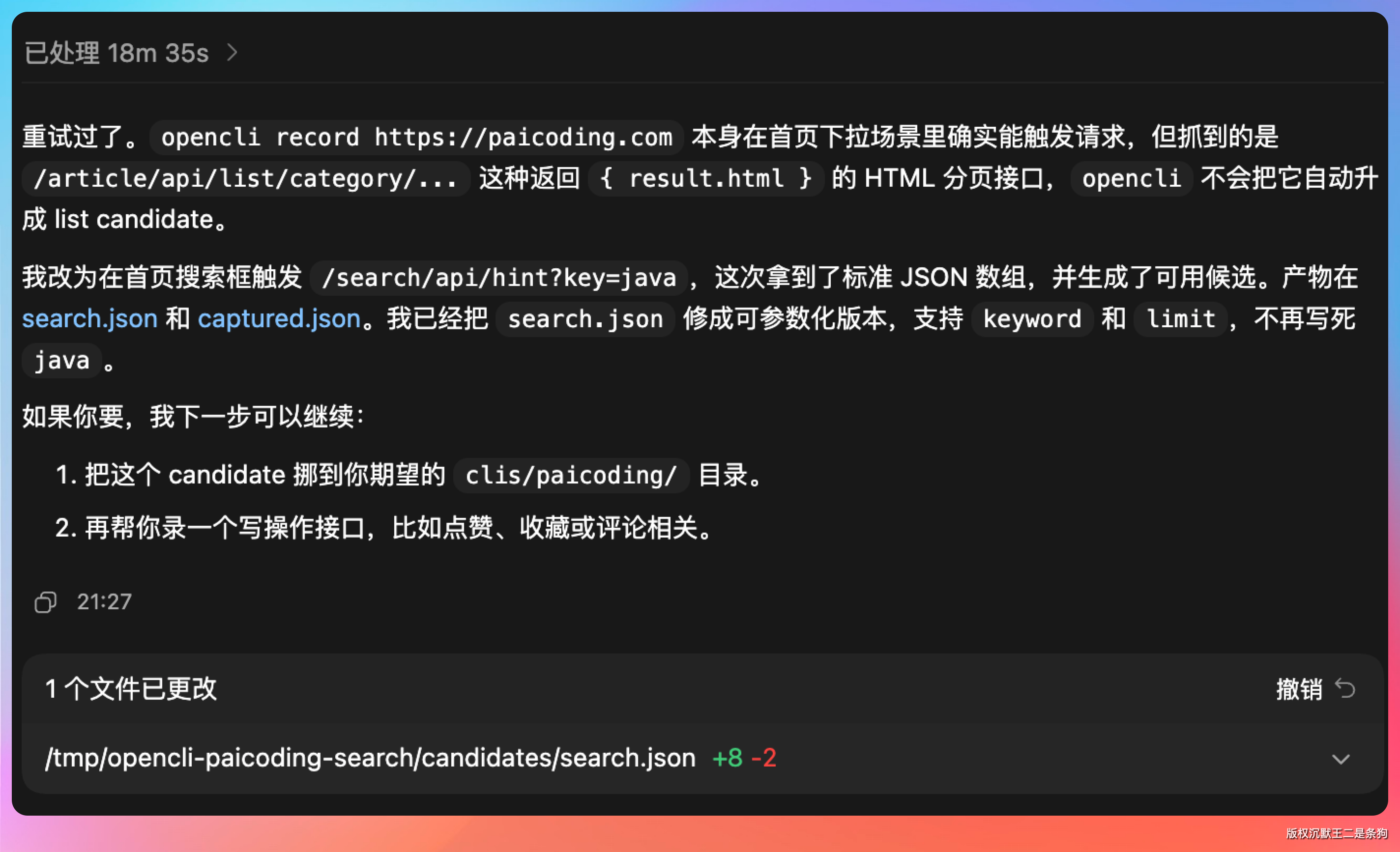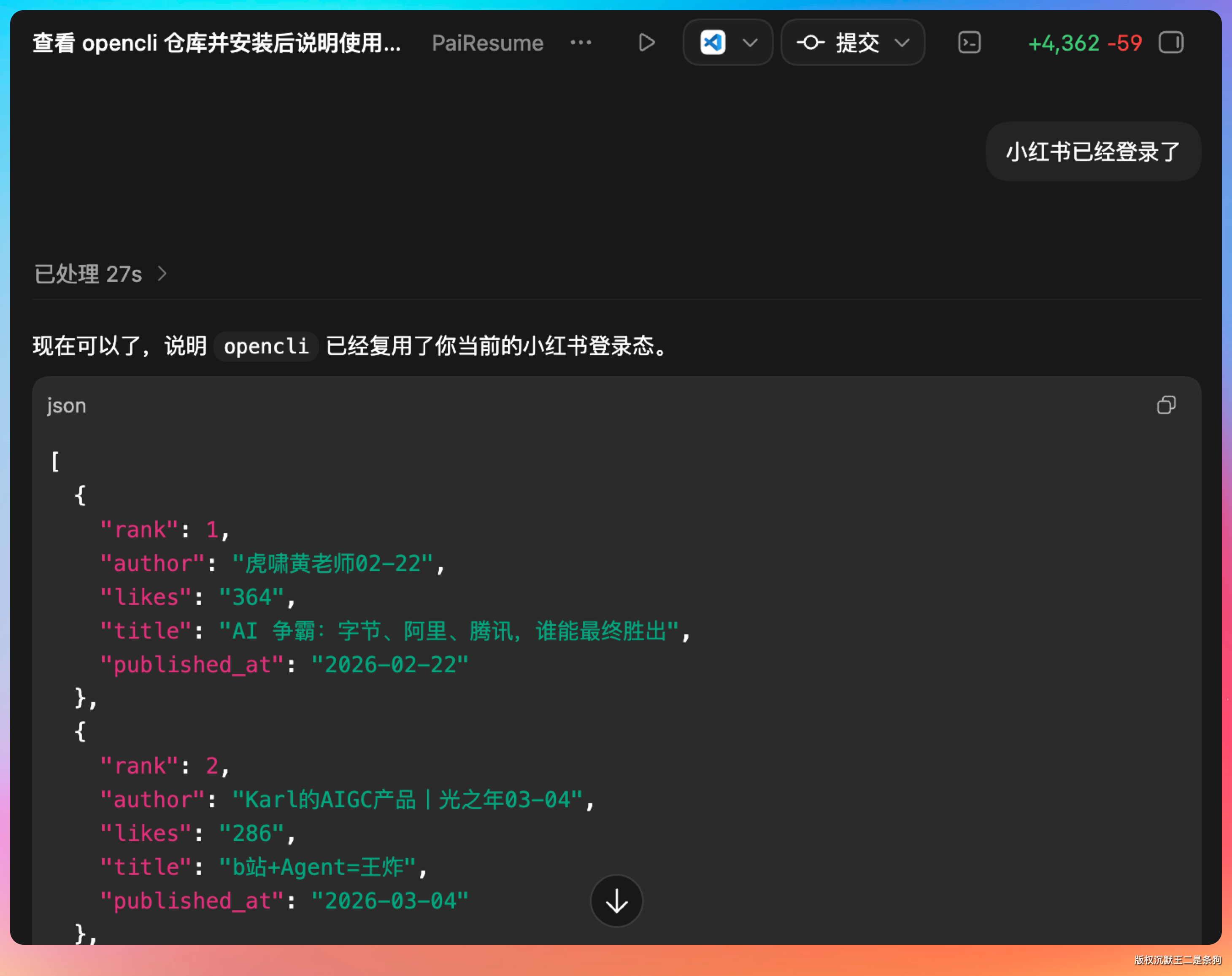 整个过程不需要我去浏览器的 Network 面板翻请求,不需要我分析 API 文档,OpenCLI 用拦截器把整个活儿都干了。