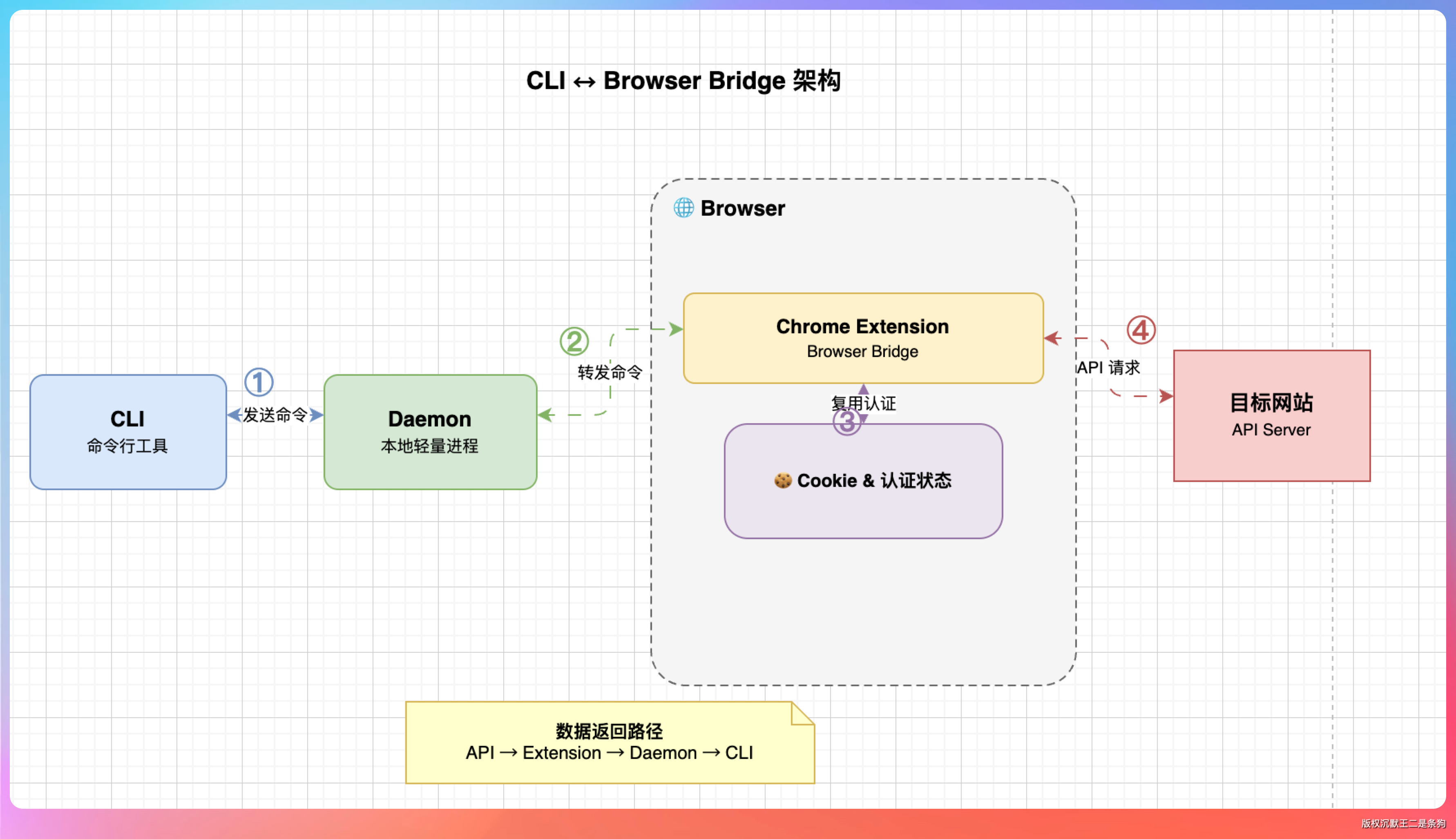 CLI 发命令给 Daemon,Daemon 转发给 Chrome 扩展,扩展用浏览器已有的 cookie 和认证状态去请求目标网站的 API,拿到数据后原路返回。