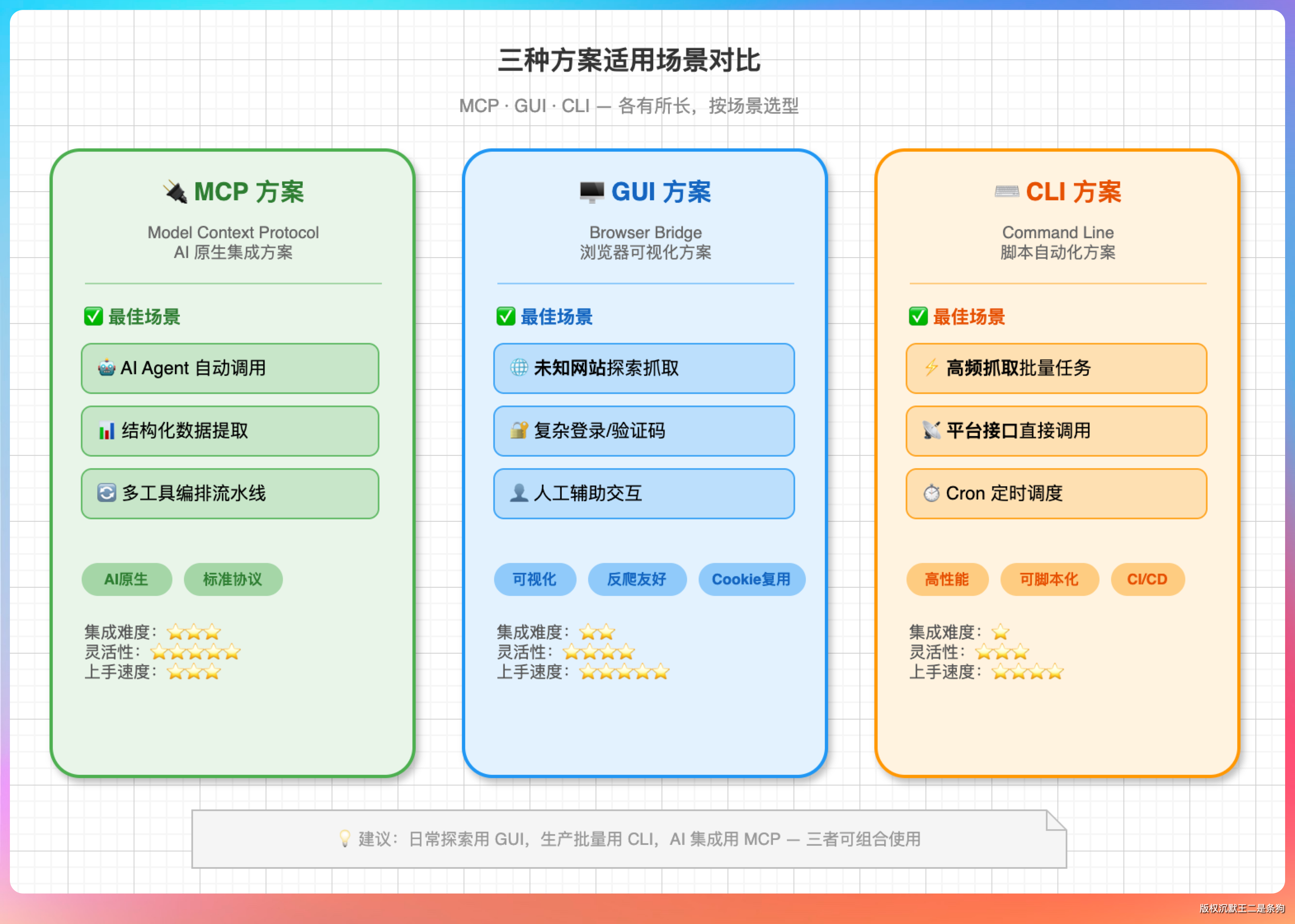 搭配使用,才是当前最务实的 Agent 工具层策略。不要把鸡蛋放在一个篮子里,要根据具体场景选择最合适的方案。