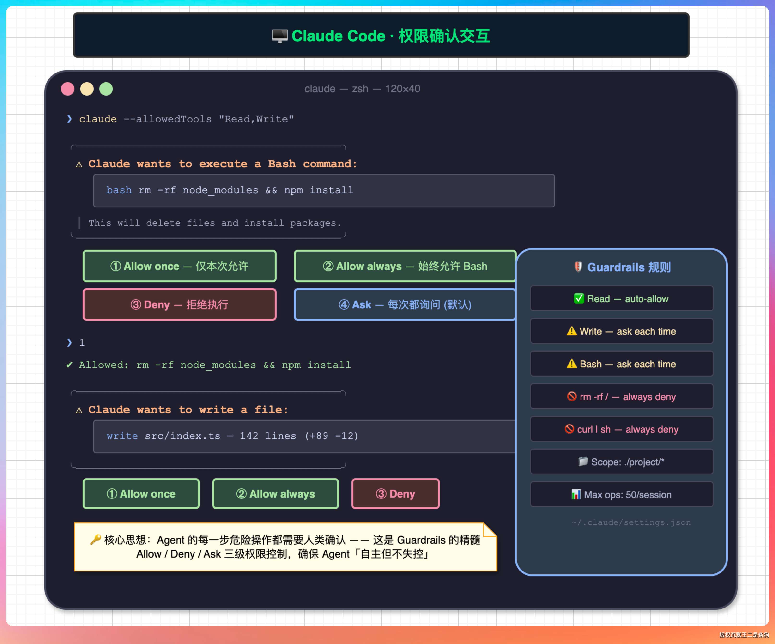 三是对不确定性的敬畏。 Guardrails、Hooks、权限审批,这些机制全都承认一件事——模型会犯错,系统必须兜底。