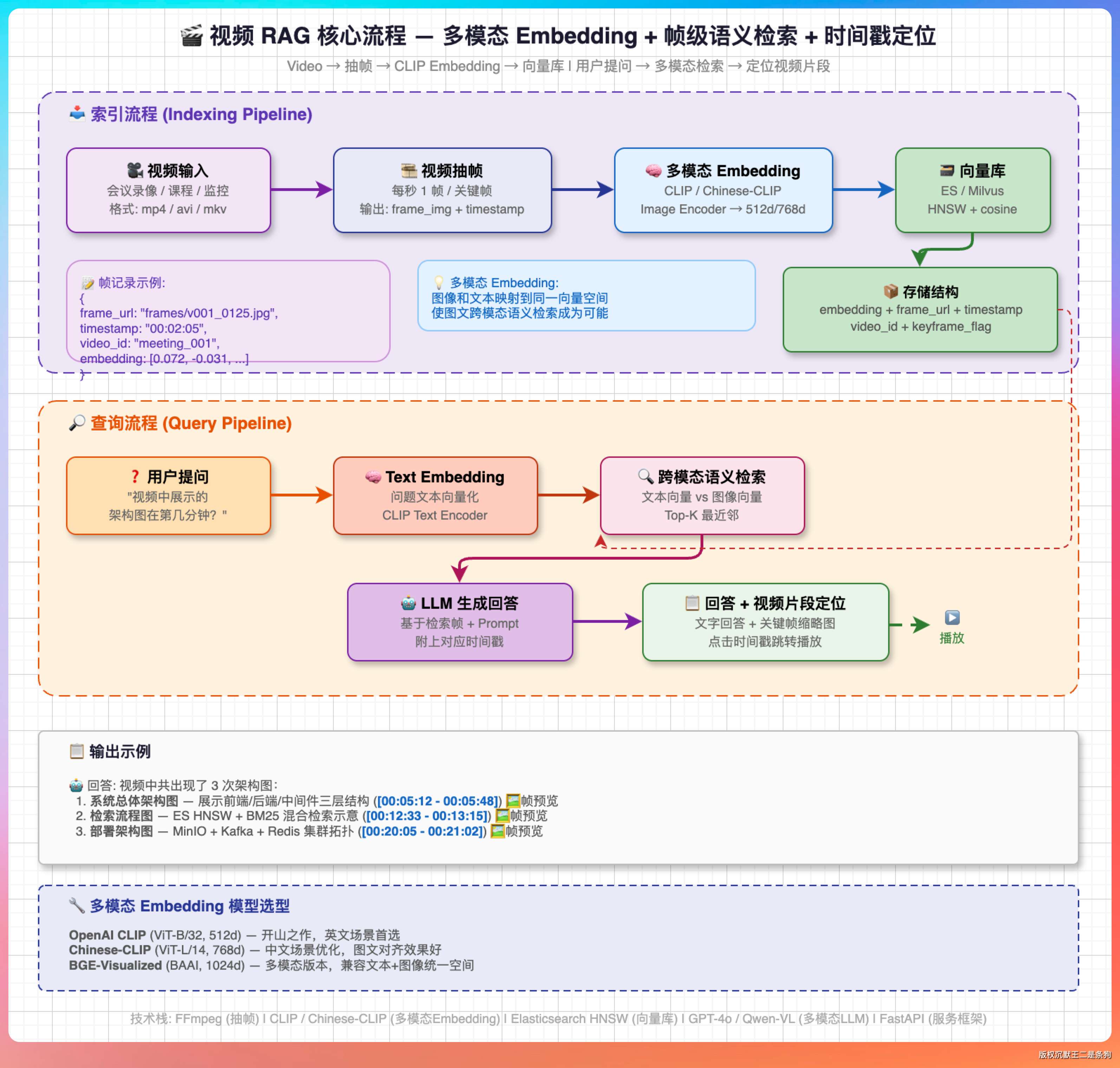 核心流程是这样的:把视频按一定频率抽帧(比如每秒抽一帧或每个关键帧抽一张),用多模态 Embedding 模型把每一帧图像转成向量,存到向量库里。用户提问的时候用同一个多模态 Embedding 模型把问题向量化(多模态模型可以同时处理文本和图像),做语义检索找到最相关的视频帧,然后基于这些帧的时间戳定位到视频片段。