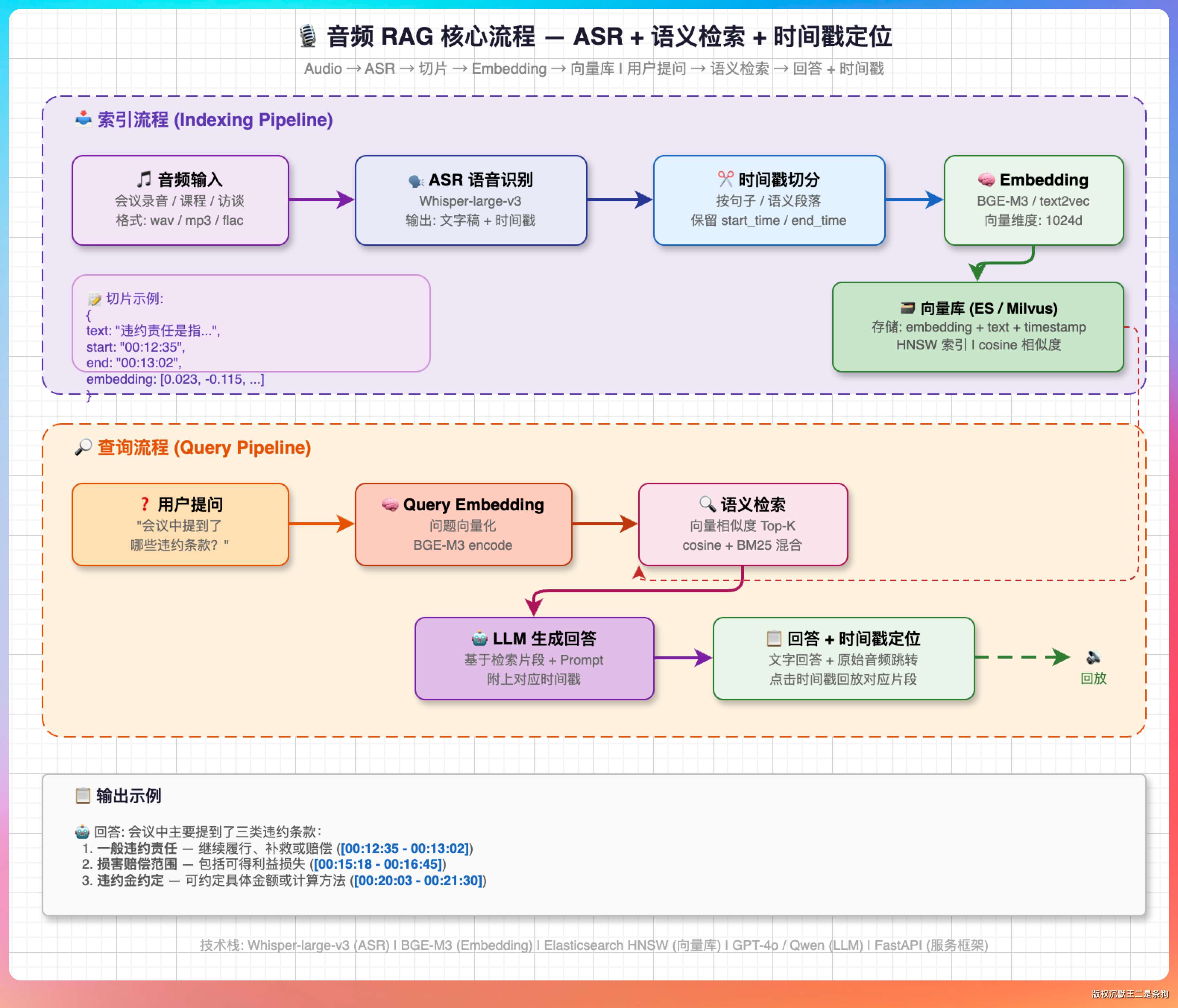 核心流程是这样的:把音频通过 ASR(自动语音识别)转成文字稿,文字稿按时间戳切分成片段,每个片段做 Embedding 向量化存到向量库里。