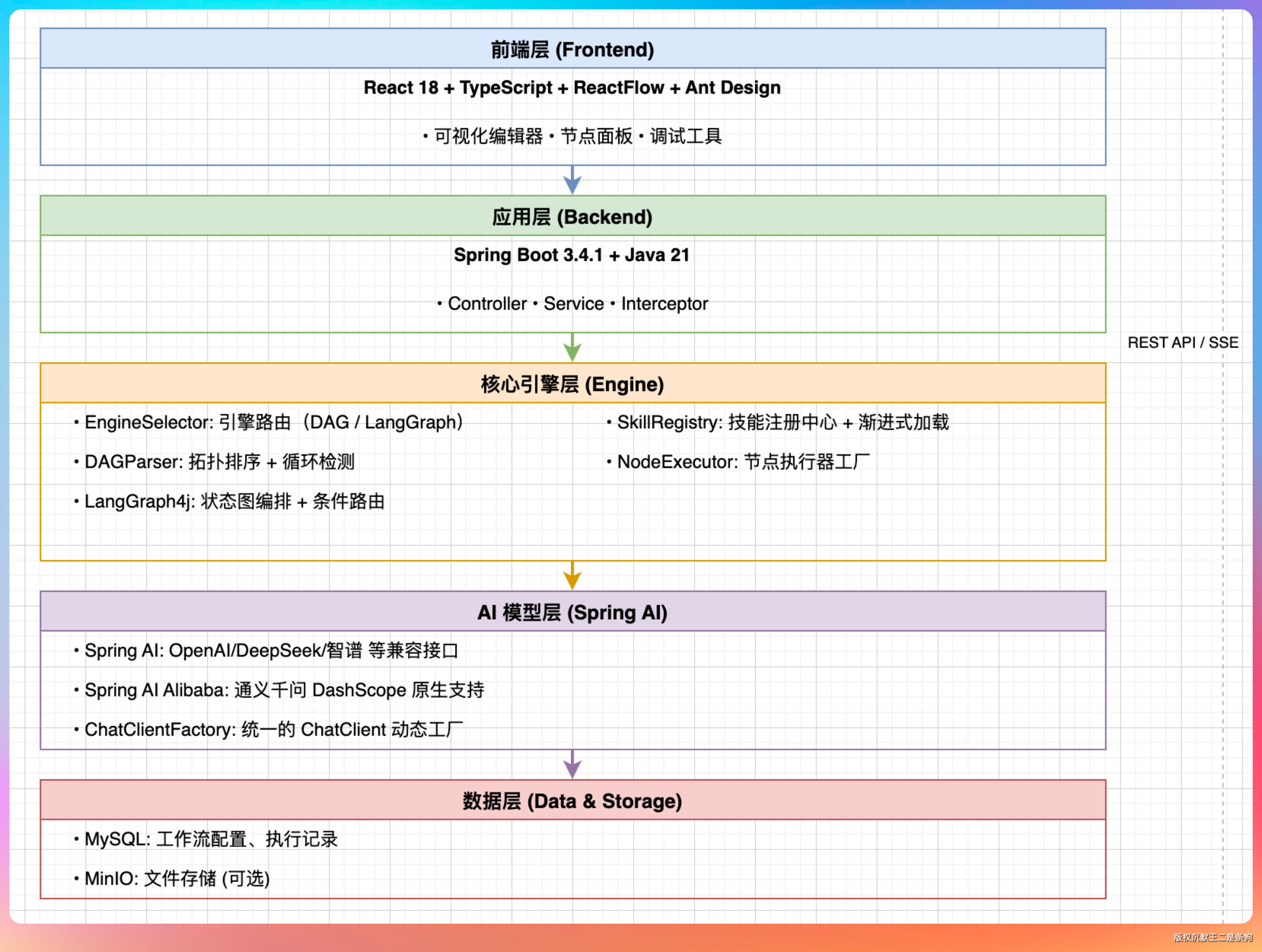 技术栈:Java 21、Spring Boot 3.4、Spring AI 1.0、LangGraph4j 1.8、React 18、ReactFlow