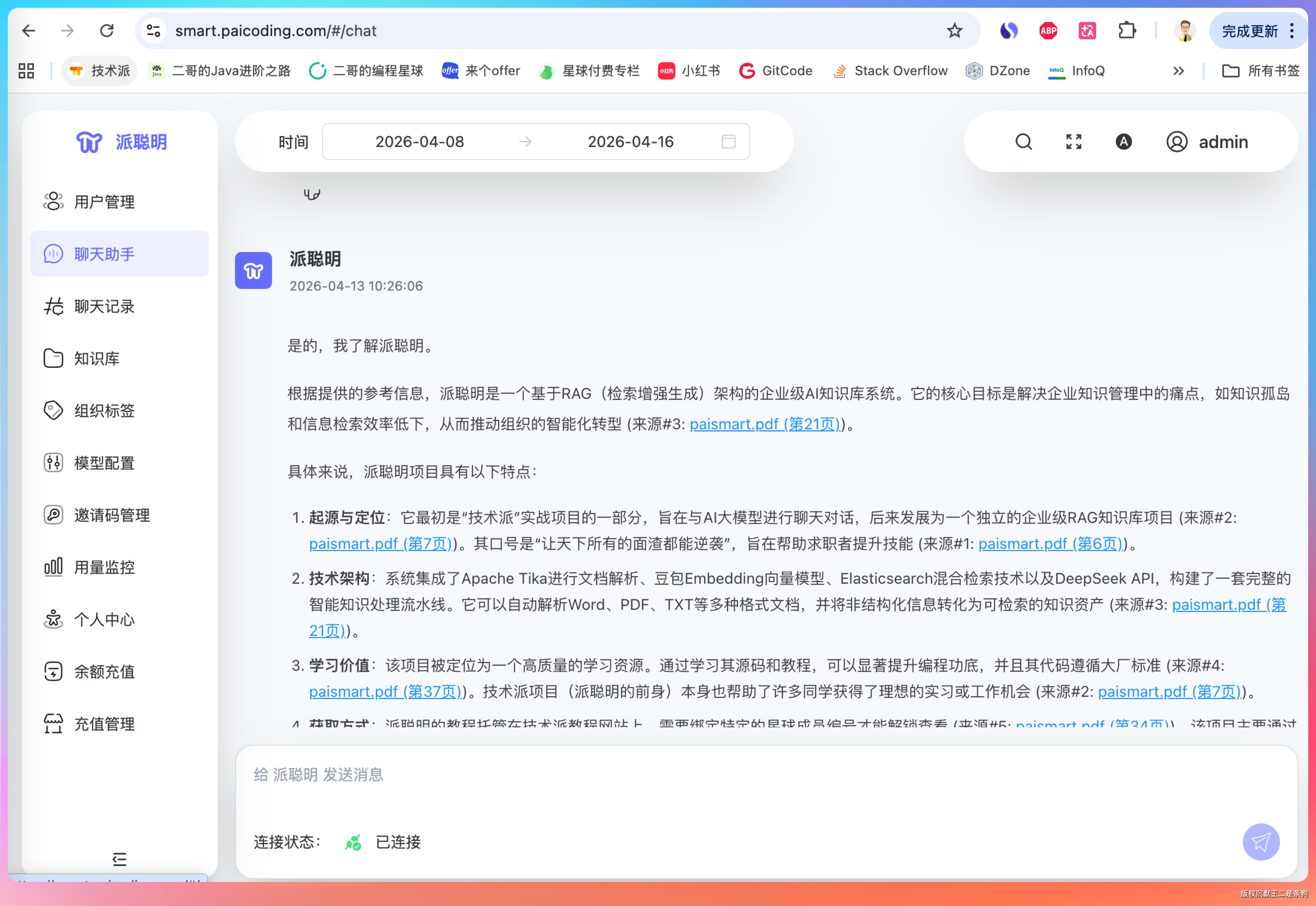 项目描述:派聪明是一个基于私有知识库的企业级智能对话平台,允许用户上传文档构建专属知识空间,并通过自然语言交互方式查询和获取知识。它结合了大语言模型和向量检索技术,能够让用户能够通过对话的形式与自己的知识库进行高效交互。