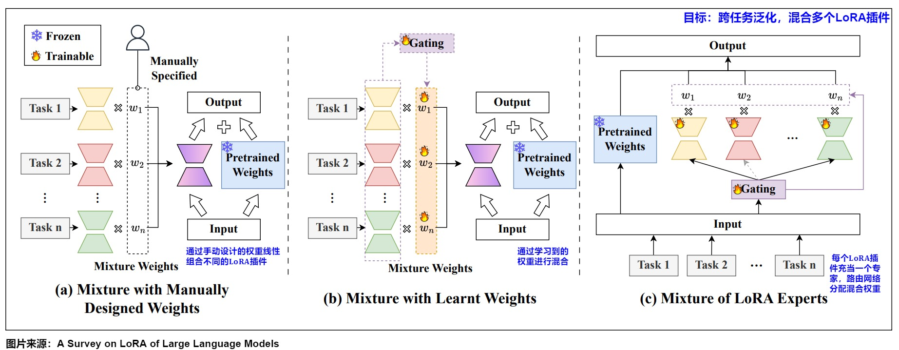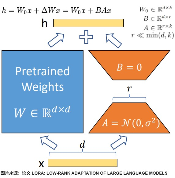 LoRA 的思路是:不改原书,在原书上做注解。这个注解是两个很小的矩阵 B 和 A,原始权重 W 完全不动,训练的时候只更新 B 和 A。推理时把注解的内容“叠加”到原书上:h = Wx + BAx。