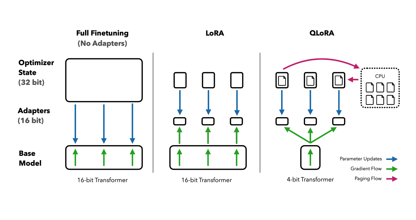 第三,显存不够就借内存。 训练时优化器(Adam)要记录每个参数的历史梯度信息,这部分占的显存比模型本身还多。QLoRA 在显存快满的时候,自动把这些信息临时挪到内存里,用的时候再搬回来——类似操作系统的虚拟内存机制。