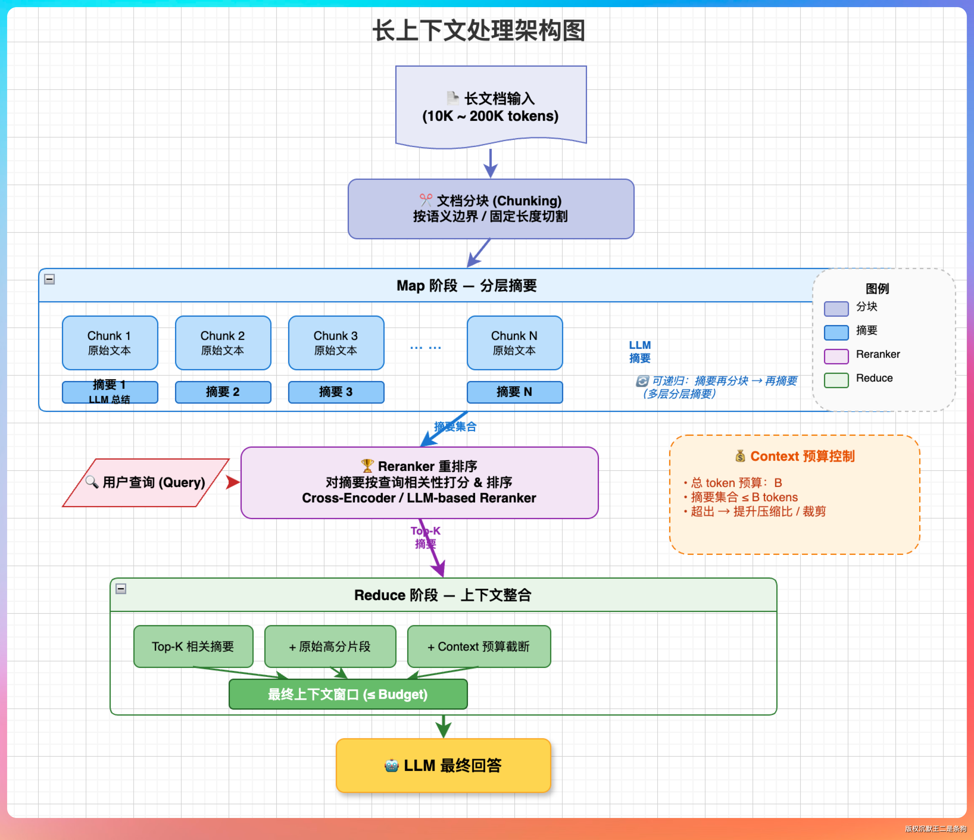 “方案一是 Map-Reduce:把长文档切分成多个 chunk,每个 chunk 单独问模型,然后把多个回答再合并。缺点是丢失跨 chunk 的关联信息。”