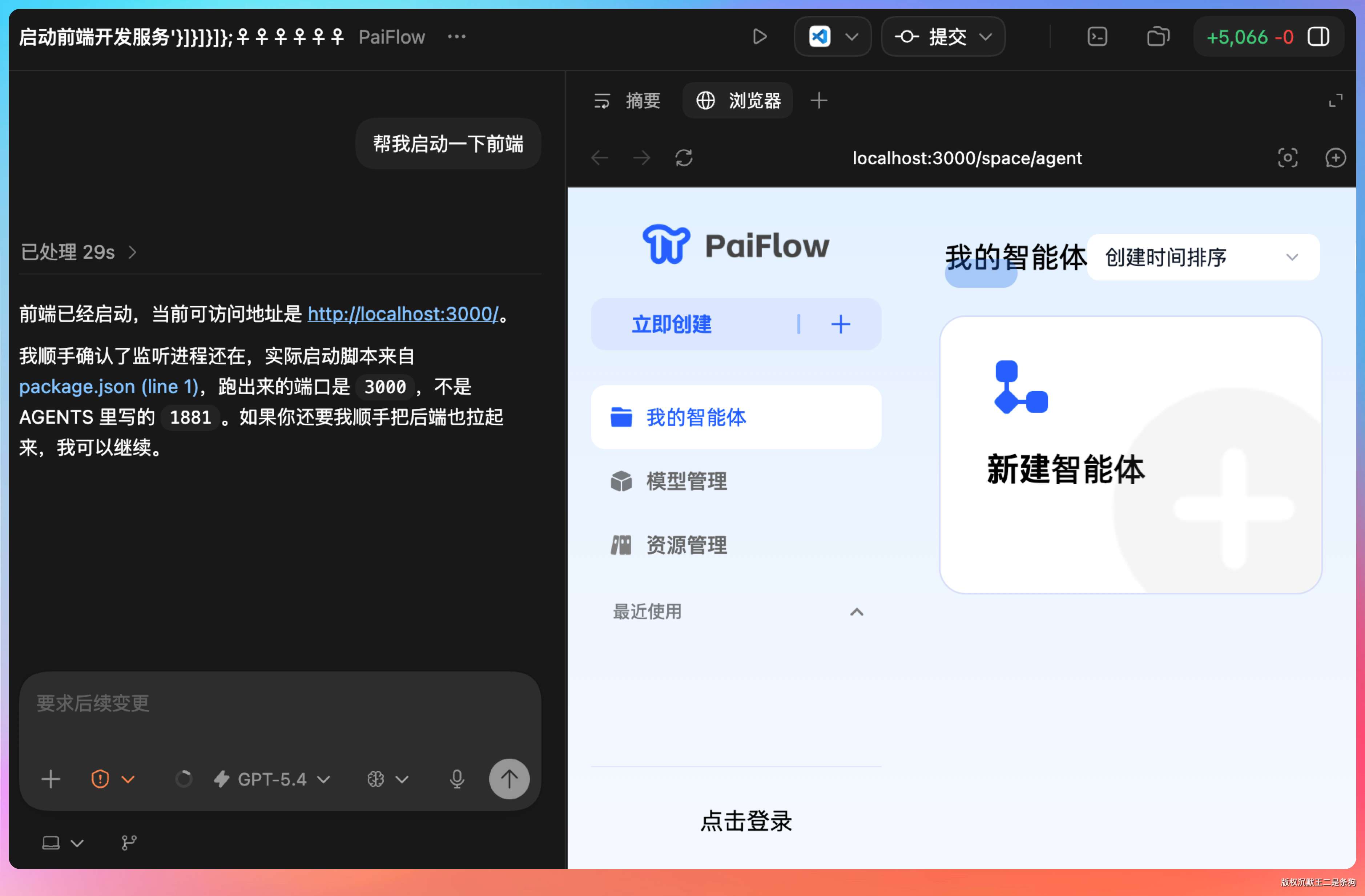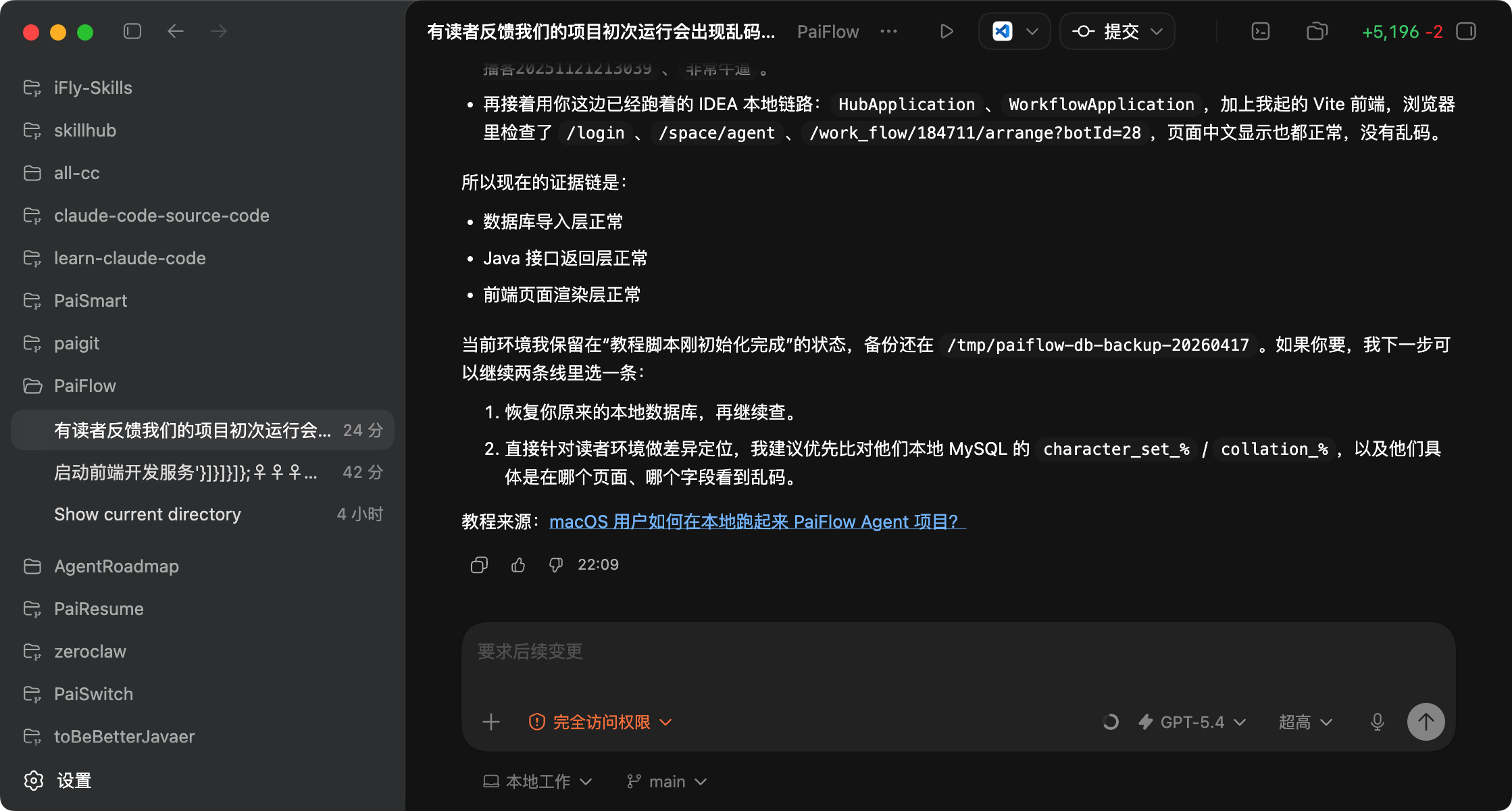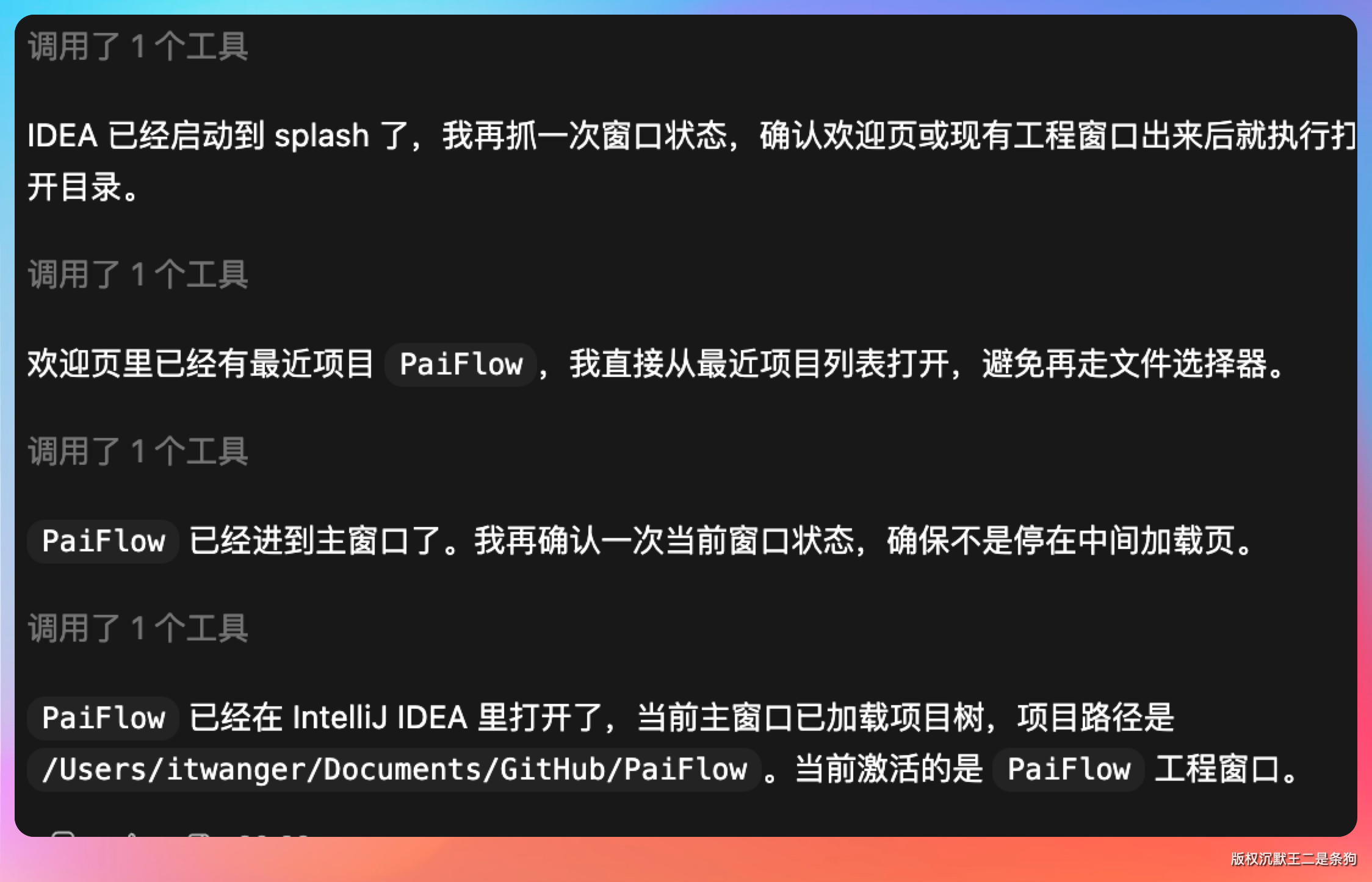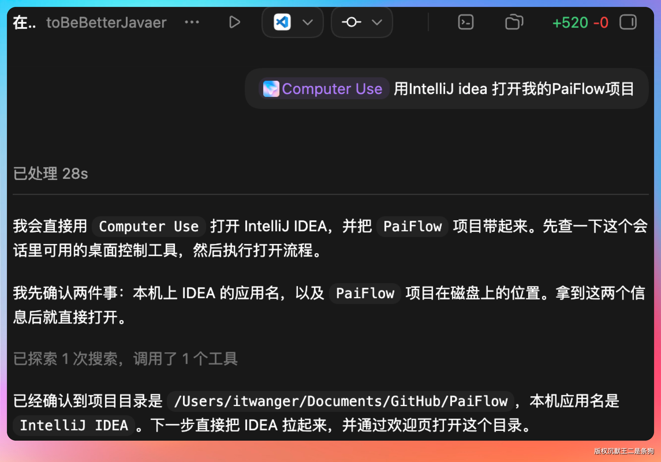 【实操环节 1】:我这里实测的场景是,让 Codex 帮我打开 IntelliJ IDEA,我的提示词是:用 IntelliJ idea 打开我的 PaiFlow 项目。