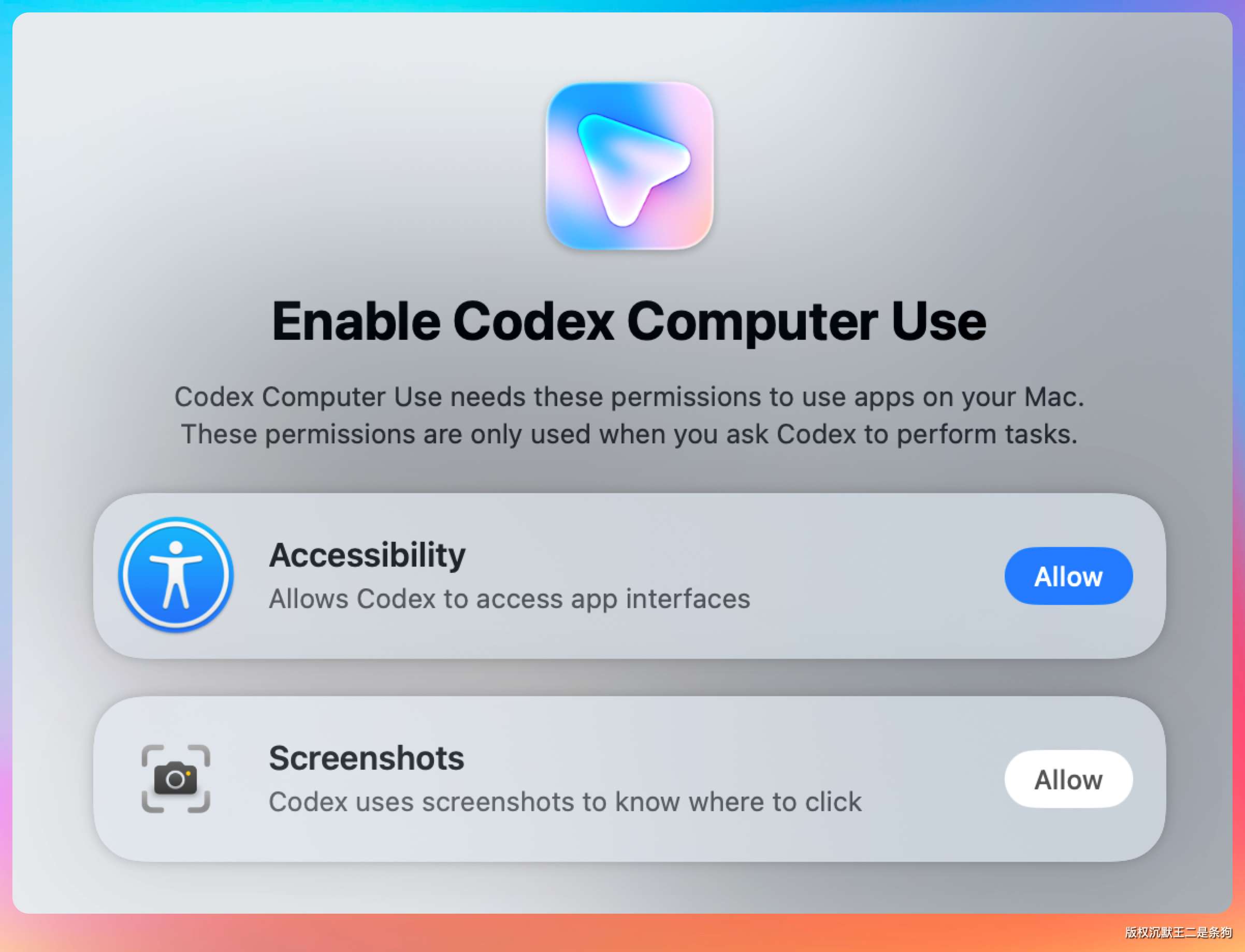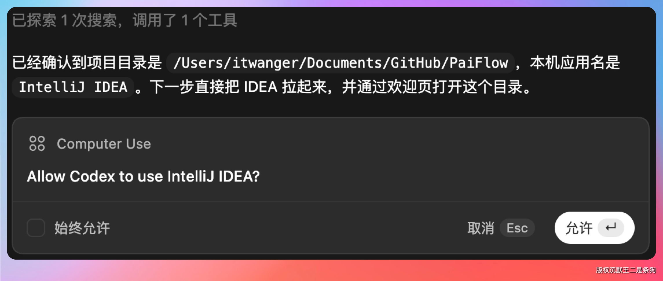 当然,第一次打开应用,Codex 会向你请示。我们可以勾选「始终允许」让下次直接用,以后就不用反复确认了。