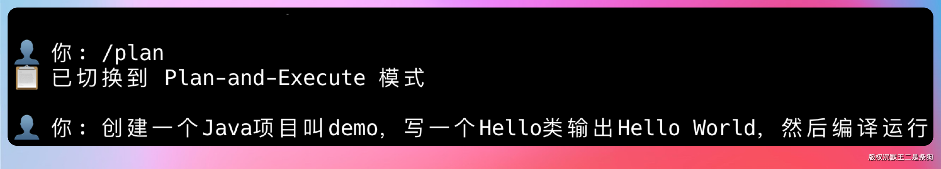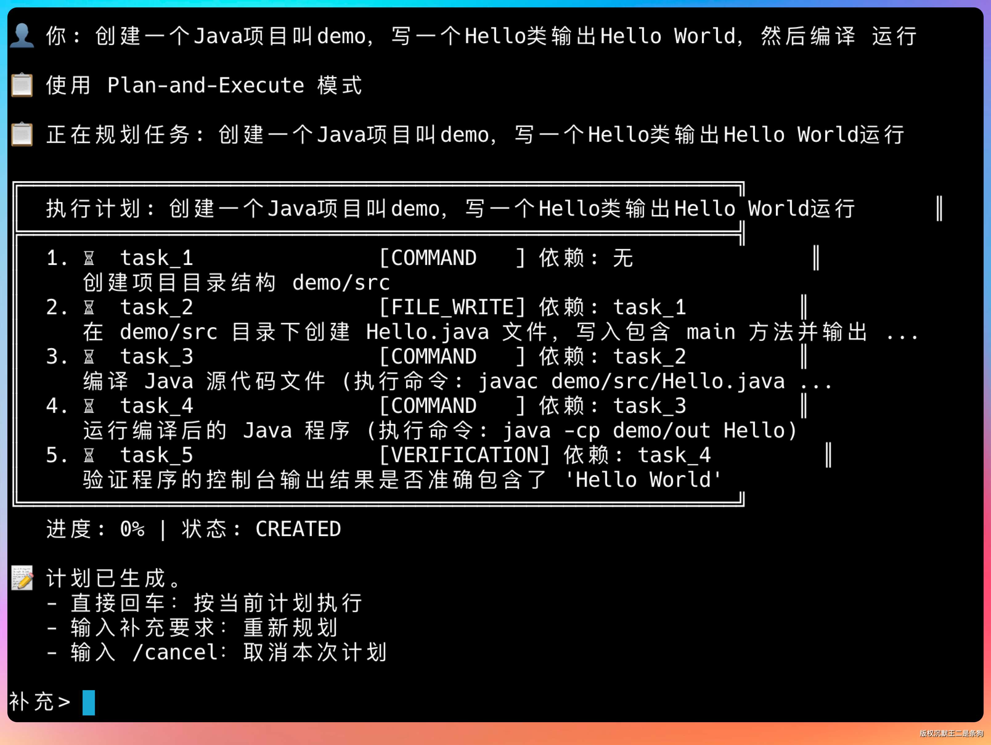 输入 /plan 进入计划模式,然后输入提示词:创建一个 Java 项目叫 demo,写一个 Hello 类输出 Hello World,然后编译运行