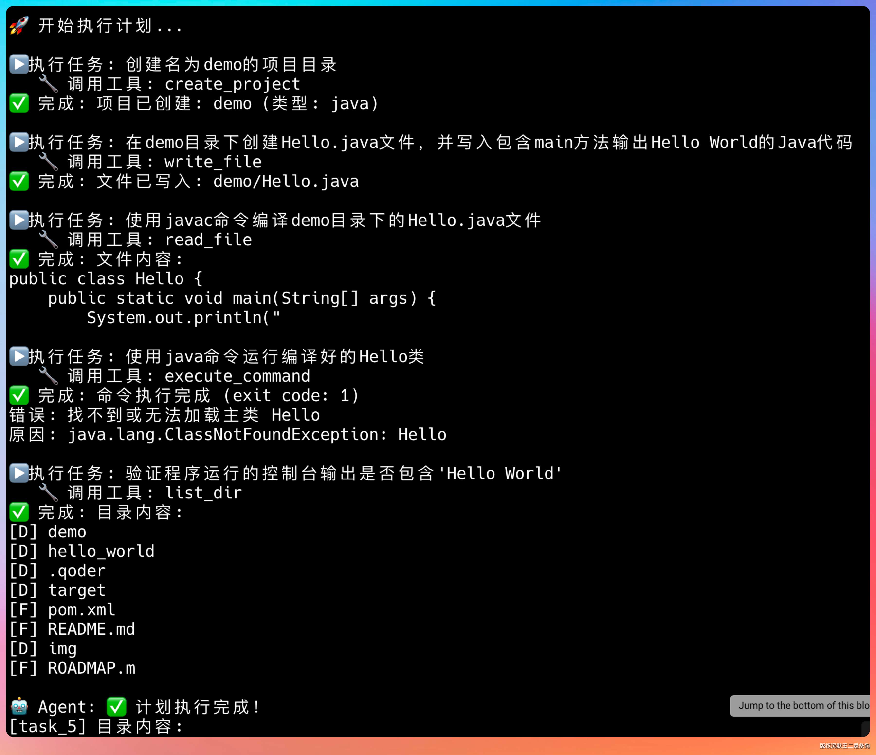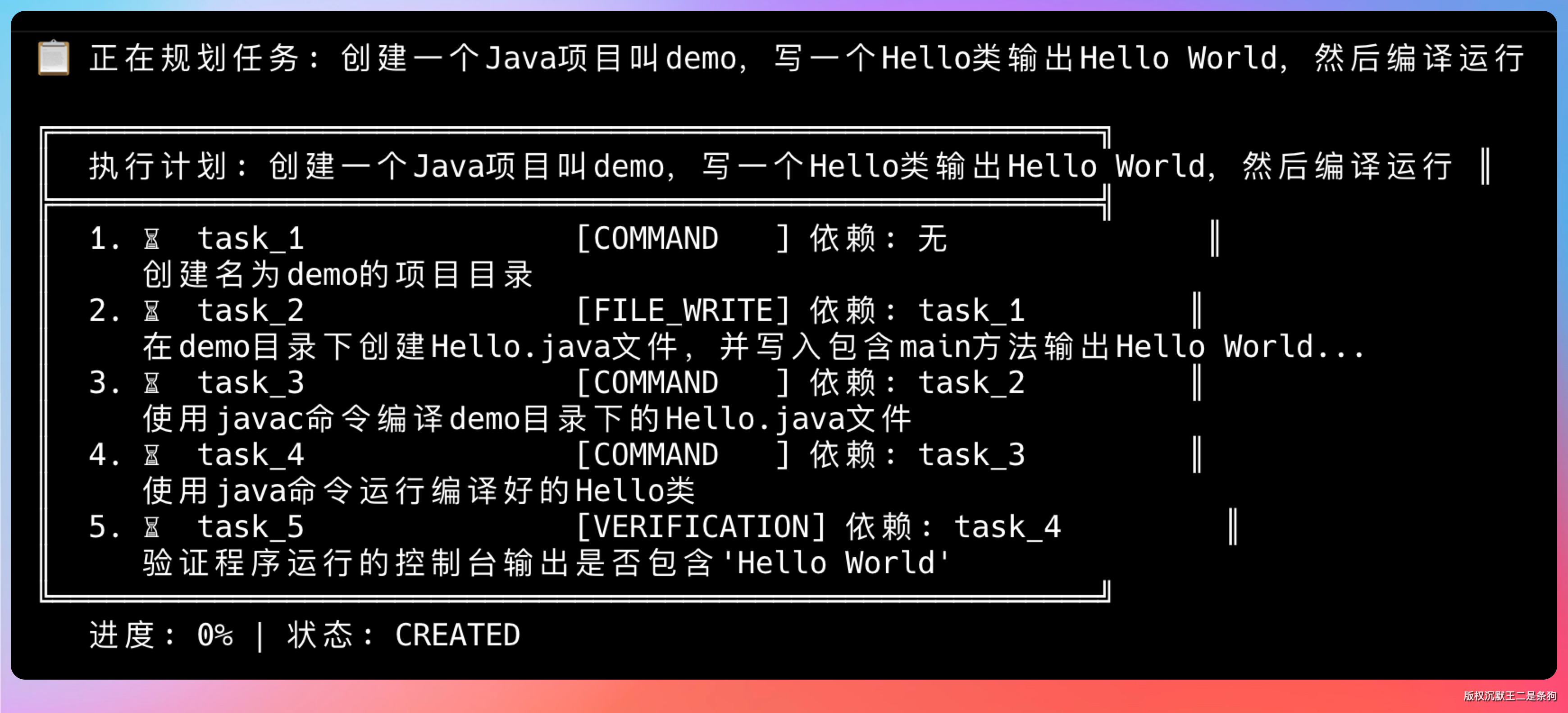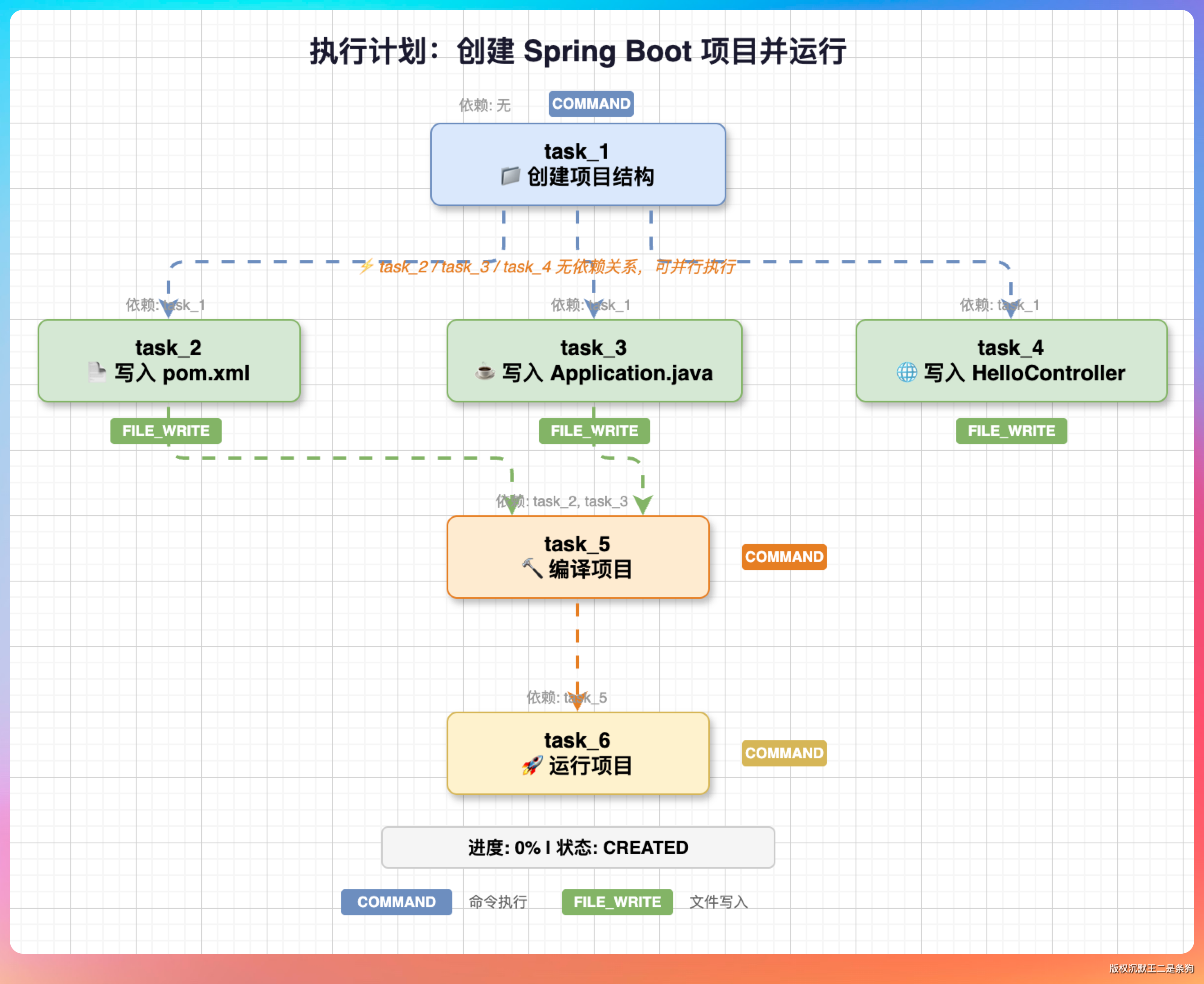 比如“创建一个 Spring Boot 项目,写个 REST API,然后打包运行”这个任务: