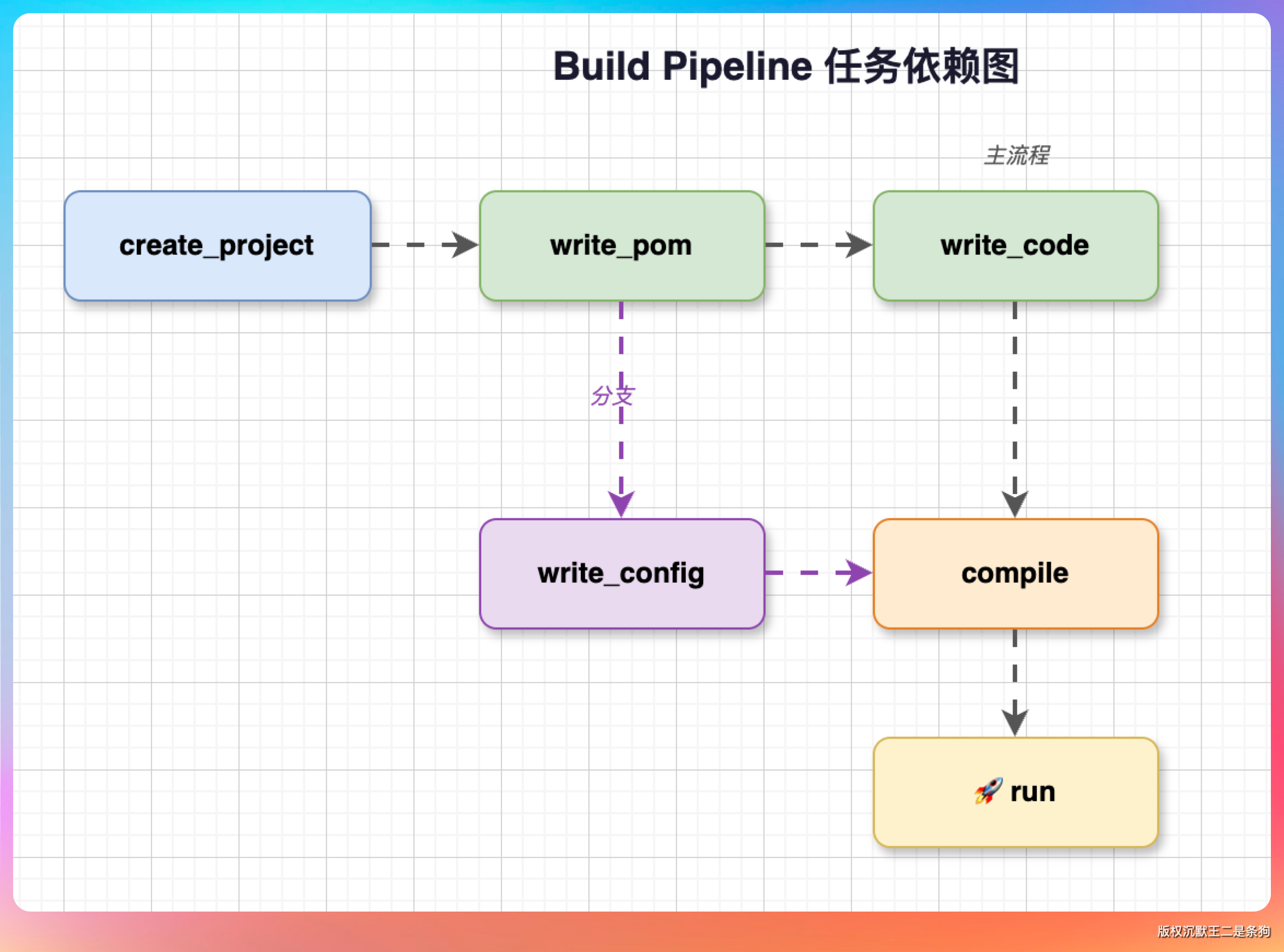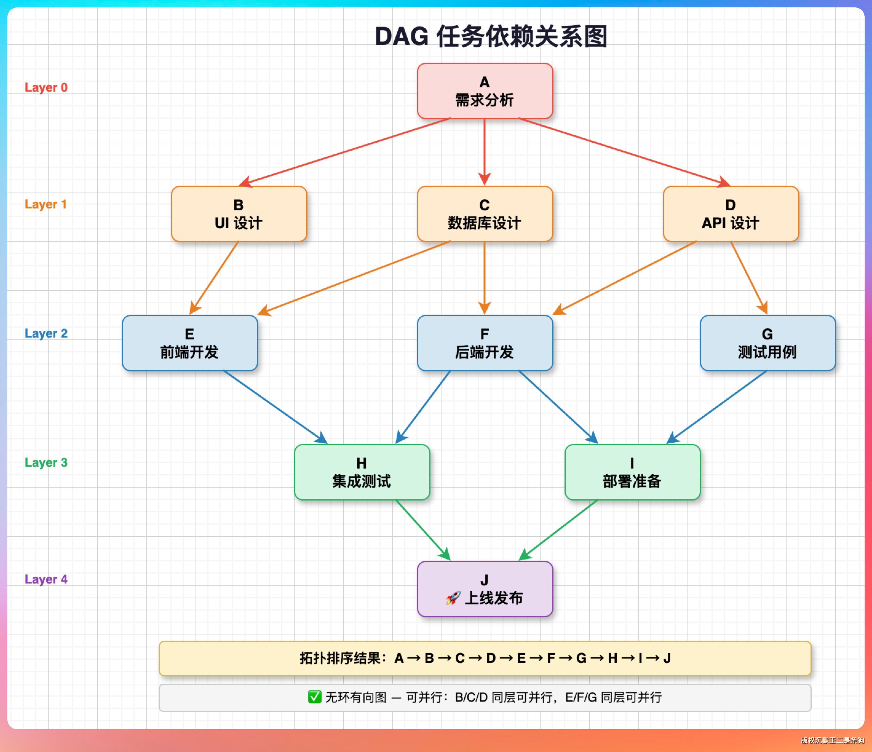 复杂任务有先后依赖。比如“写代码”依赖“创建项目”,“运行”依赖“编译”。
