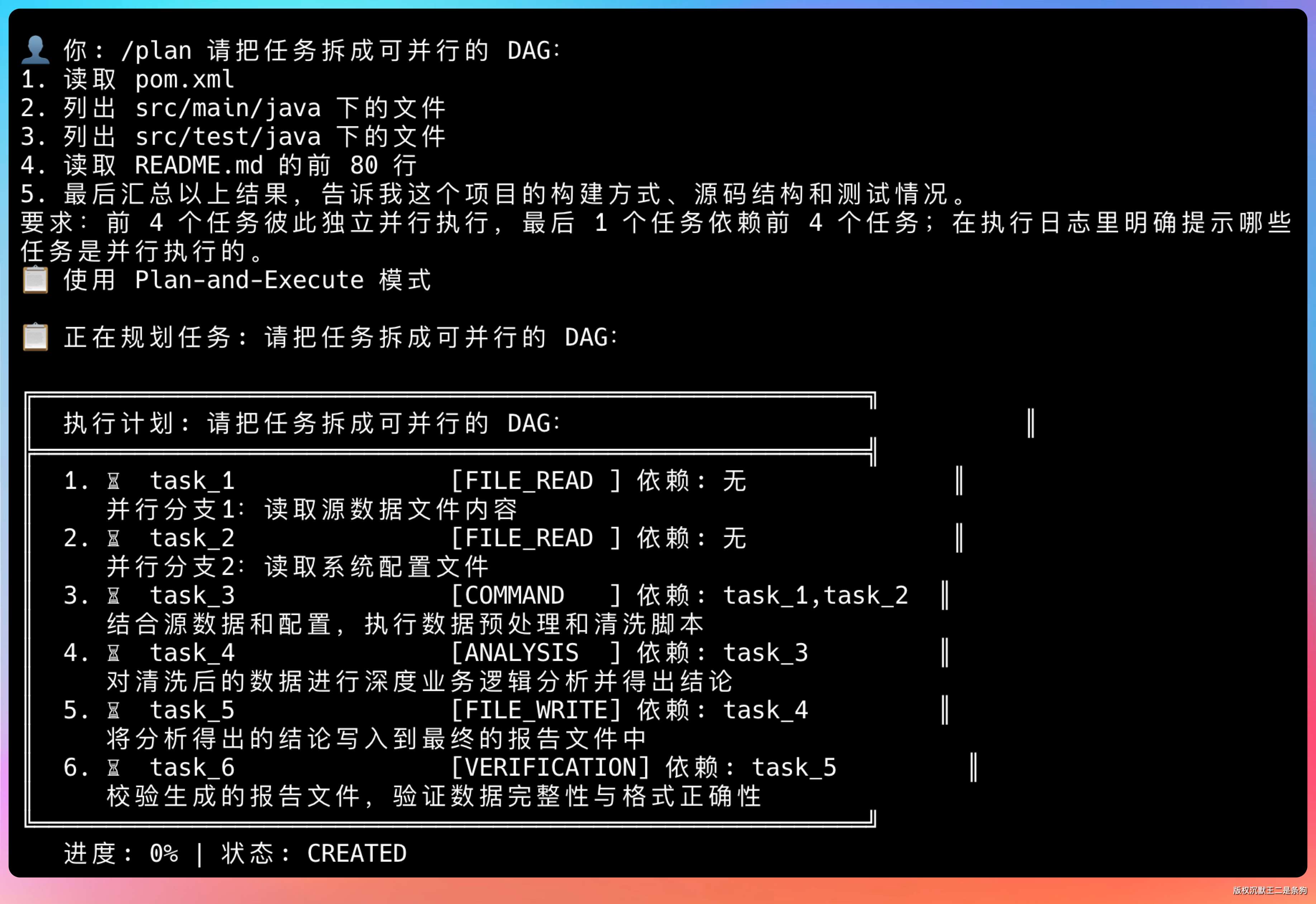 项目描述:为 Agent CLI 加入 Plan-and-Execute 能力,实现任务分解、DAG 依赖管理和拓扑排序执行。