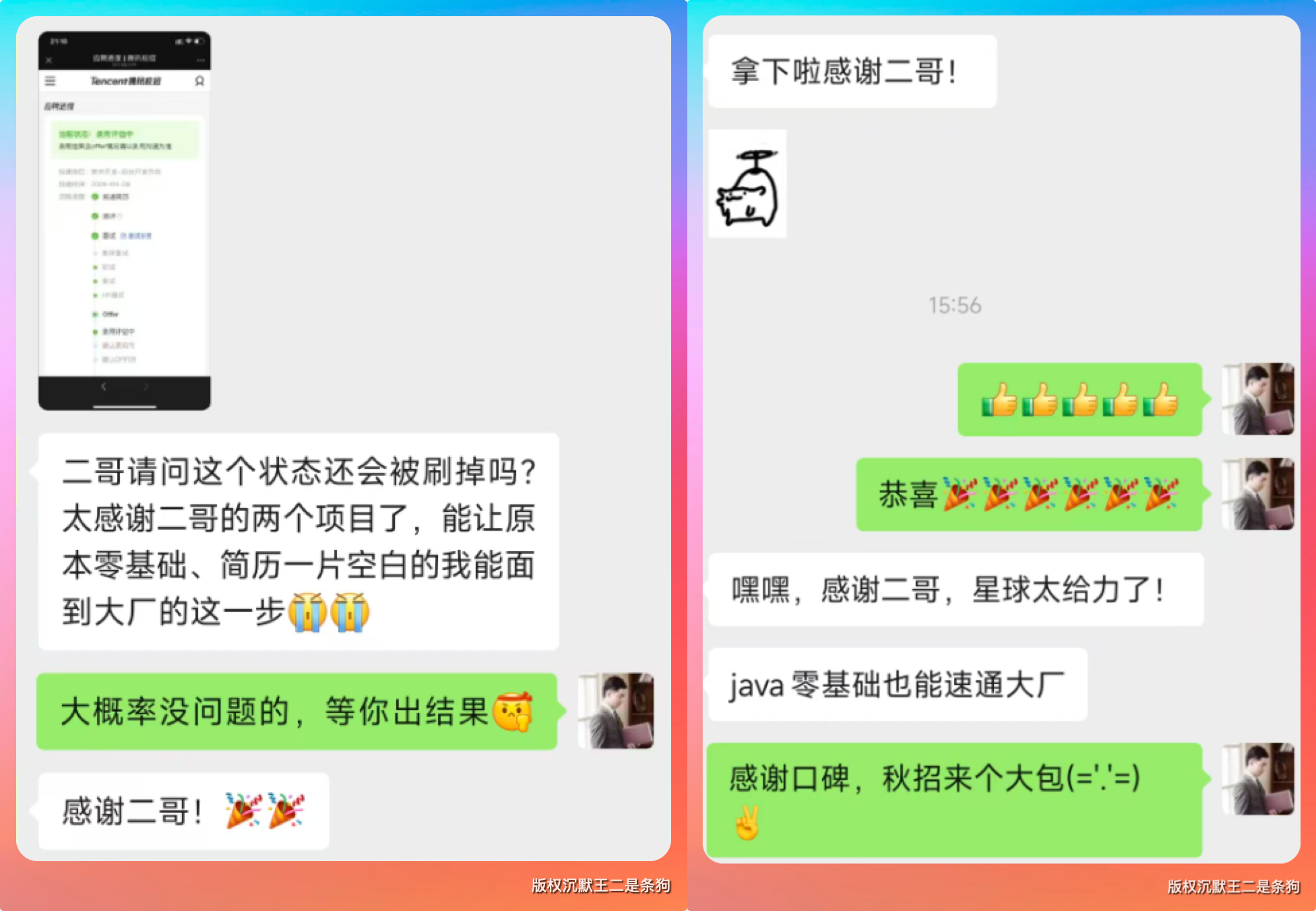 6、腾讯拿下,感谢二哥,星球太给力了!Java零基础也能速通大厂。太感谢二哥的两个项目,简历一片空白的我能面到大厂这一步。